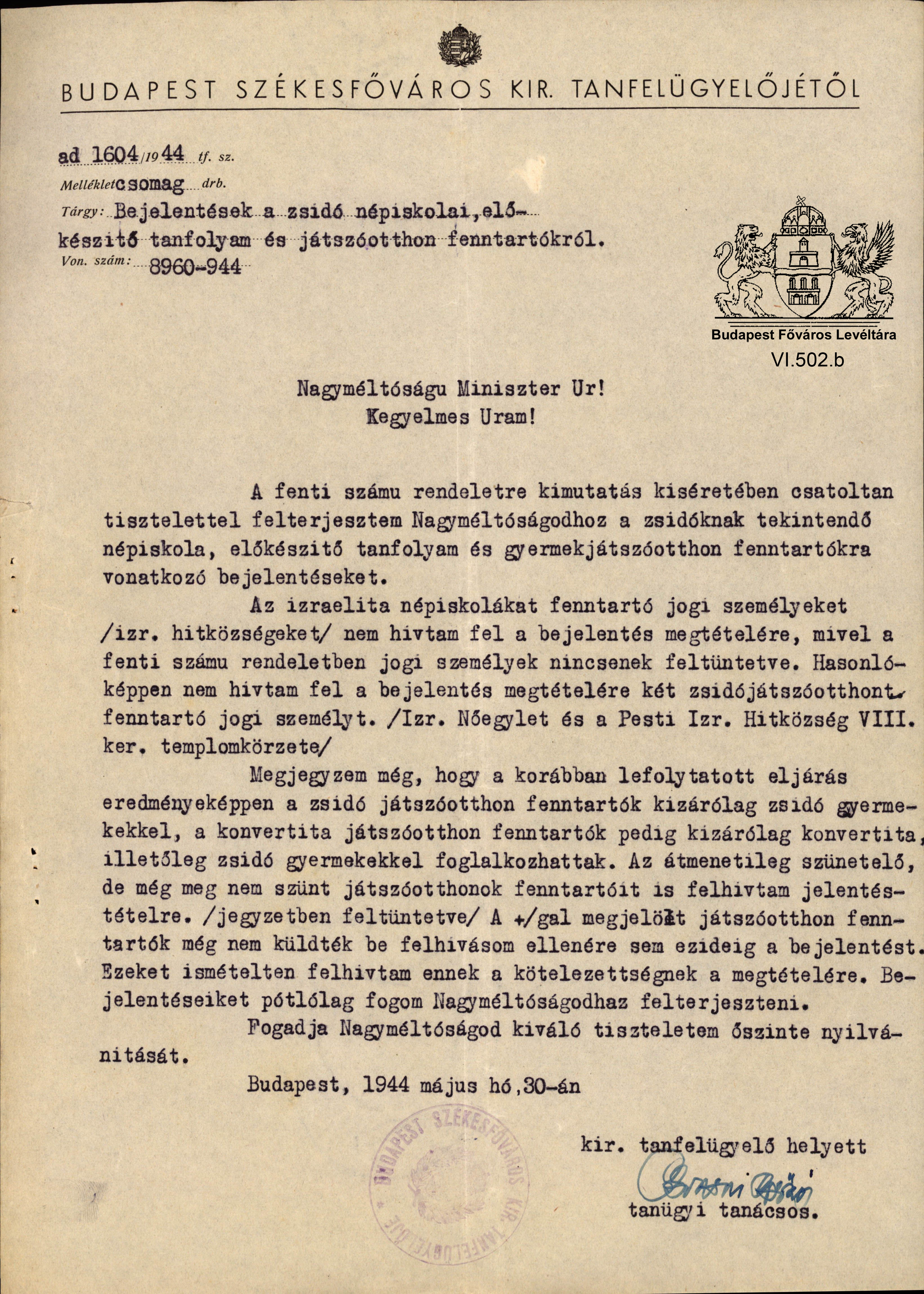 Faji megkülönböztetés az iskolában Next Toggle image Tanfelügyelői jelentés zsidó játszóotthonok fenntartóiról Type of document jelentés Date of creation 1944.05.30 Collection Budapest Főváros Levéltára Related work Faji megkülönböztetés az iskolában Reference code VI.502.b Letöltés Next