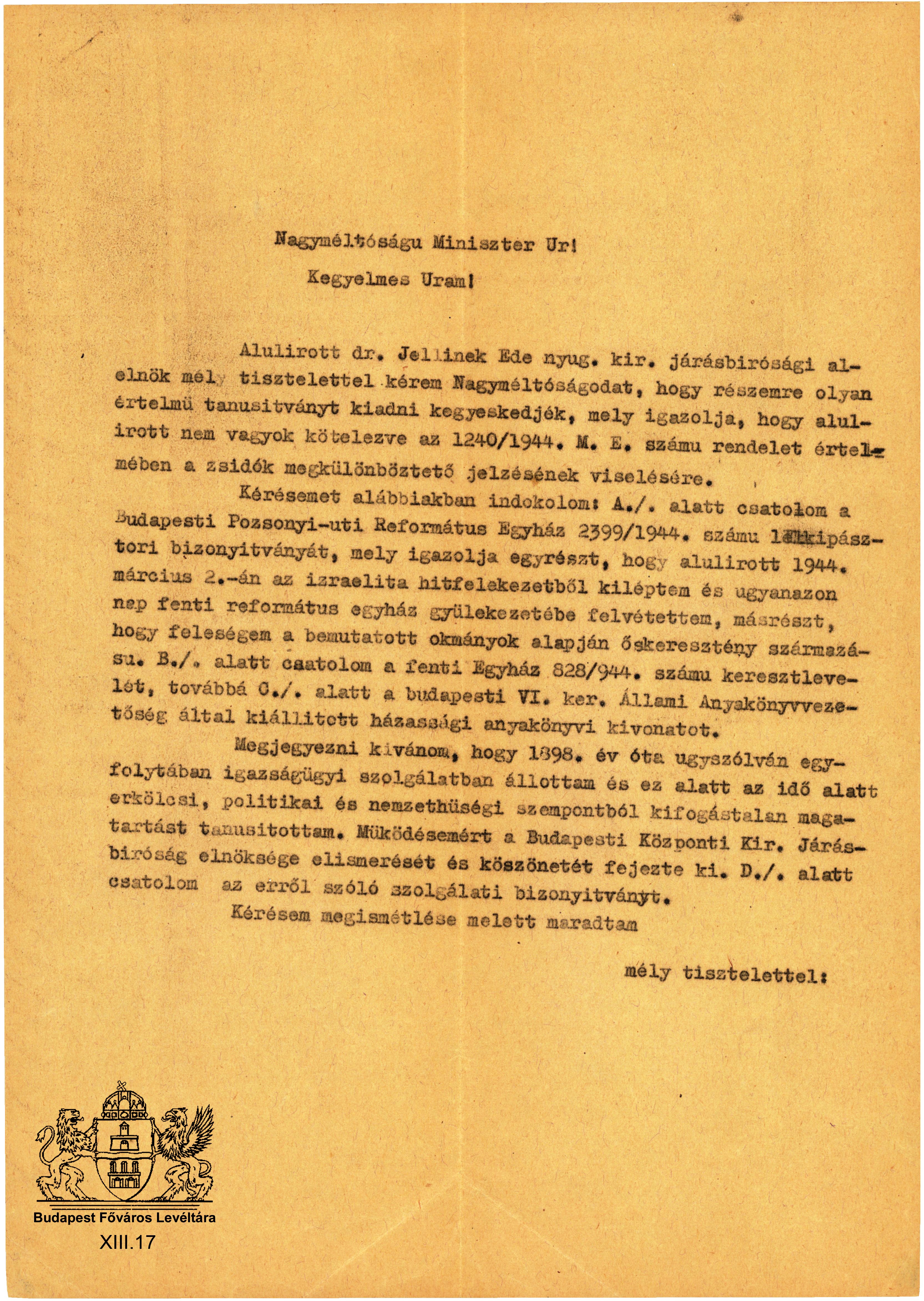 Dr. Jellinek Ede járásbírósági alelnök sárga csillag viselése alóli mentesítési kérelme