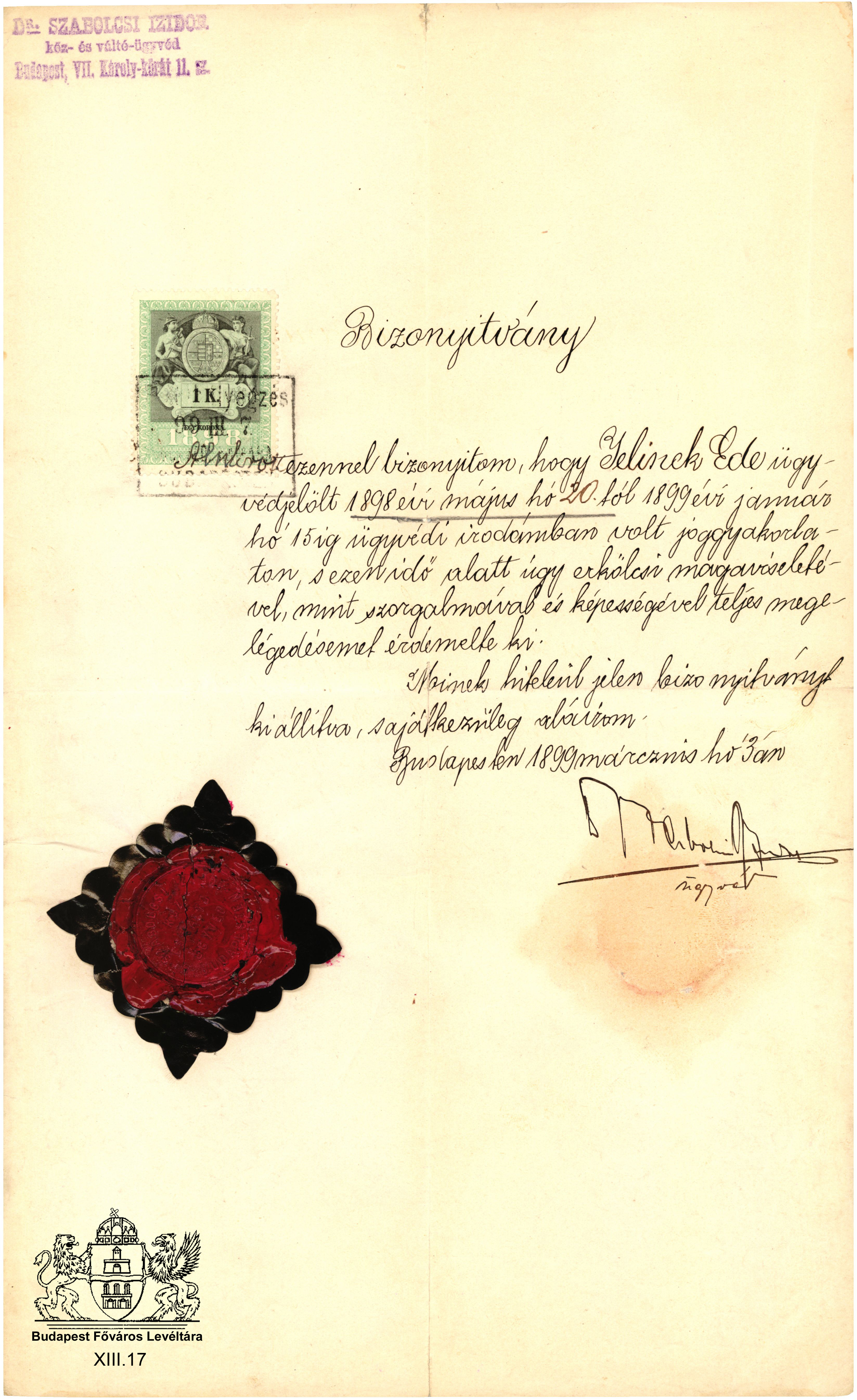 A jogfosztott járásbíró PreviousNext Toggle image Joggyakornoki bizonyítvány A bizonyítvány kiállításának dátuma: 1899. mácius 3. Type of document bizonyítvány Date of creation 1900.03.03 Collection Budapest Főváros Levéltára Related work A jogfosztott járásbíró Reference code XIII.17 Letöltés PreviousNext
