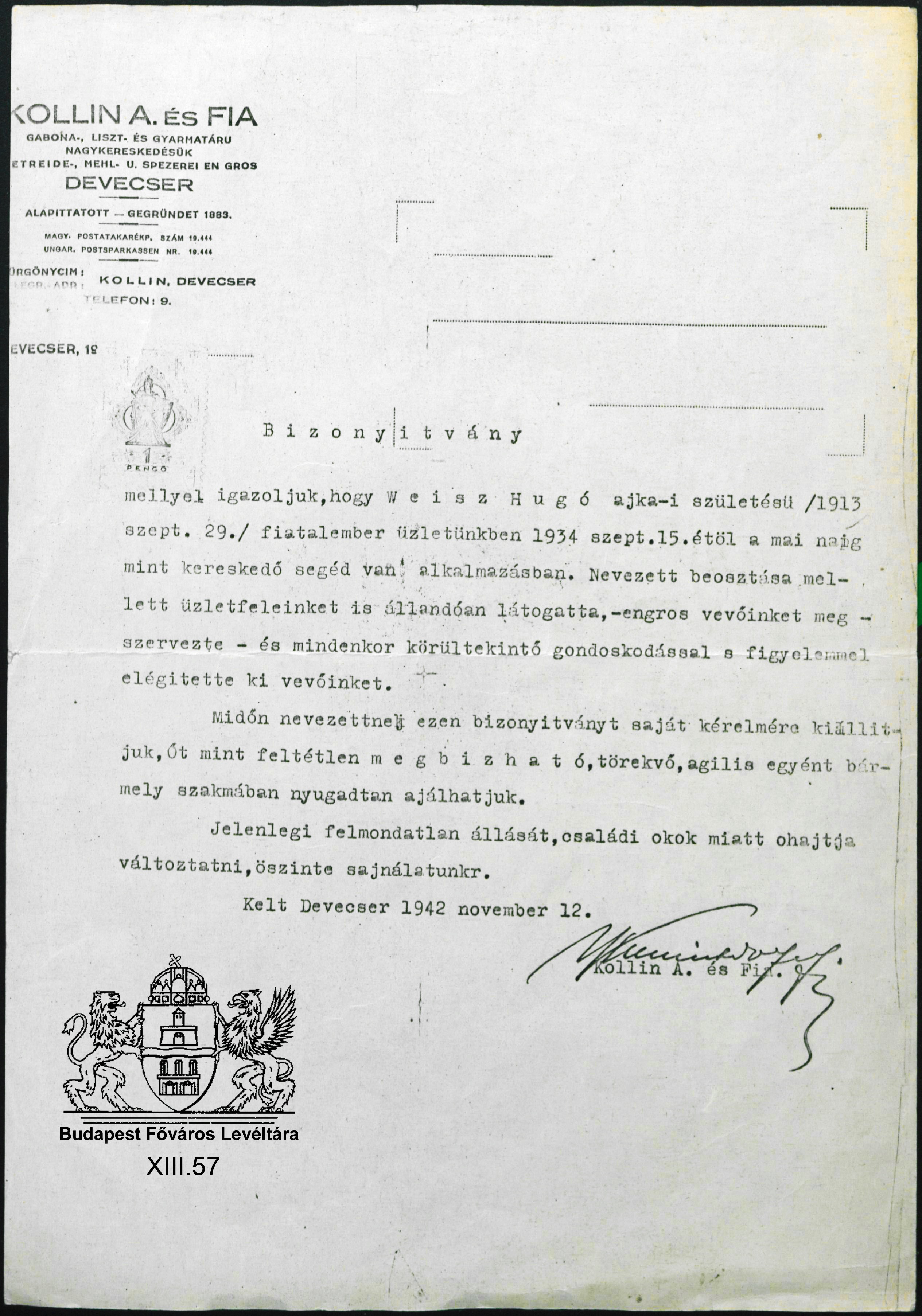 Weisz Hugónak, Bronner Artúr vejének alkalmaztatási igazolása