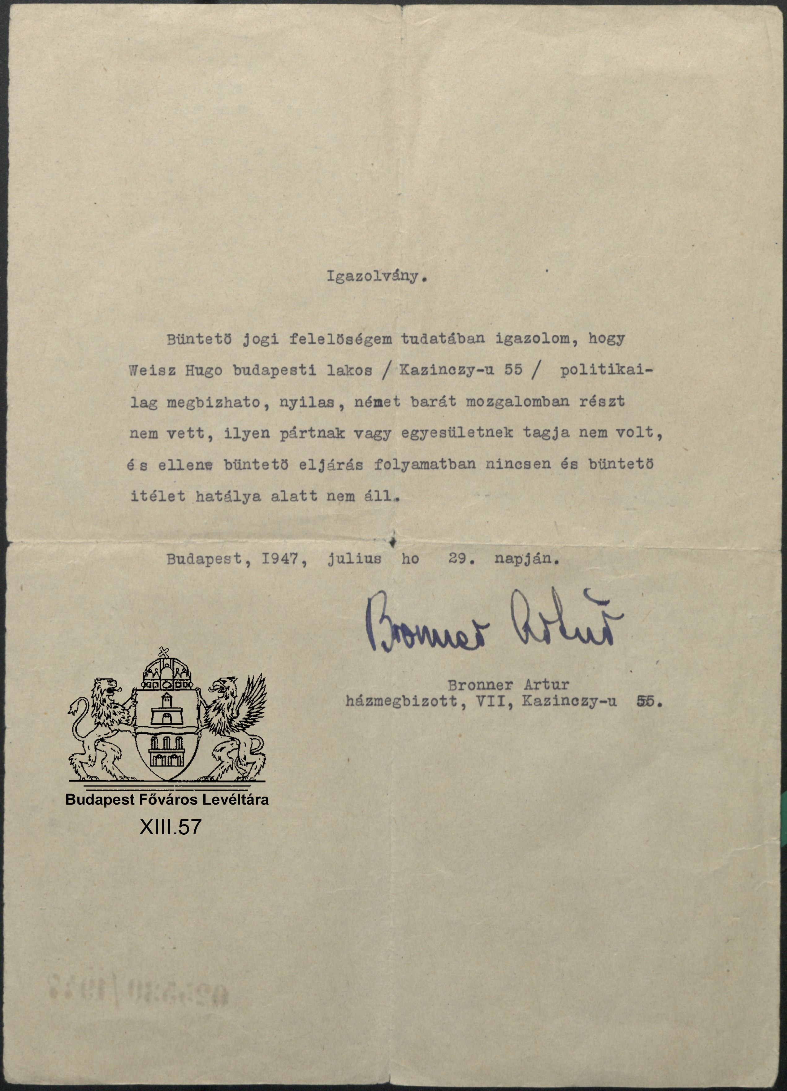 Bronner Artúr által Weisz Hugó számára kiállított igazolás