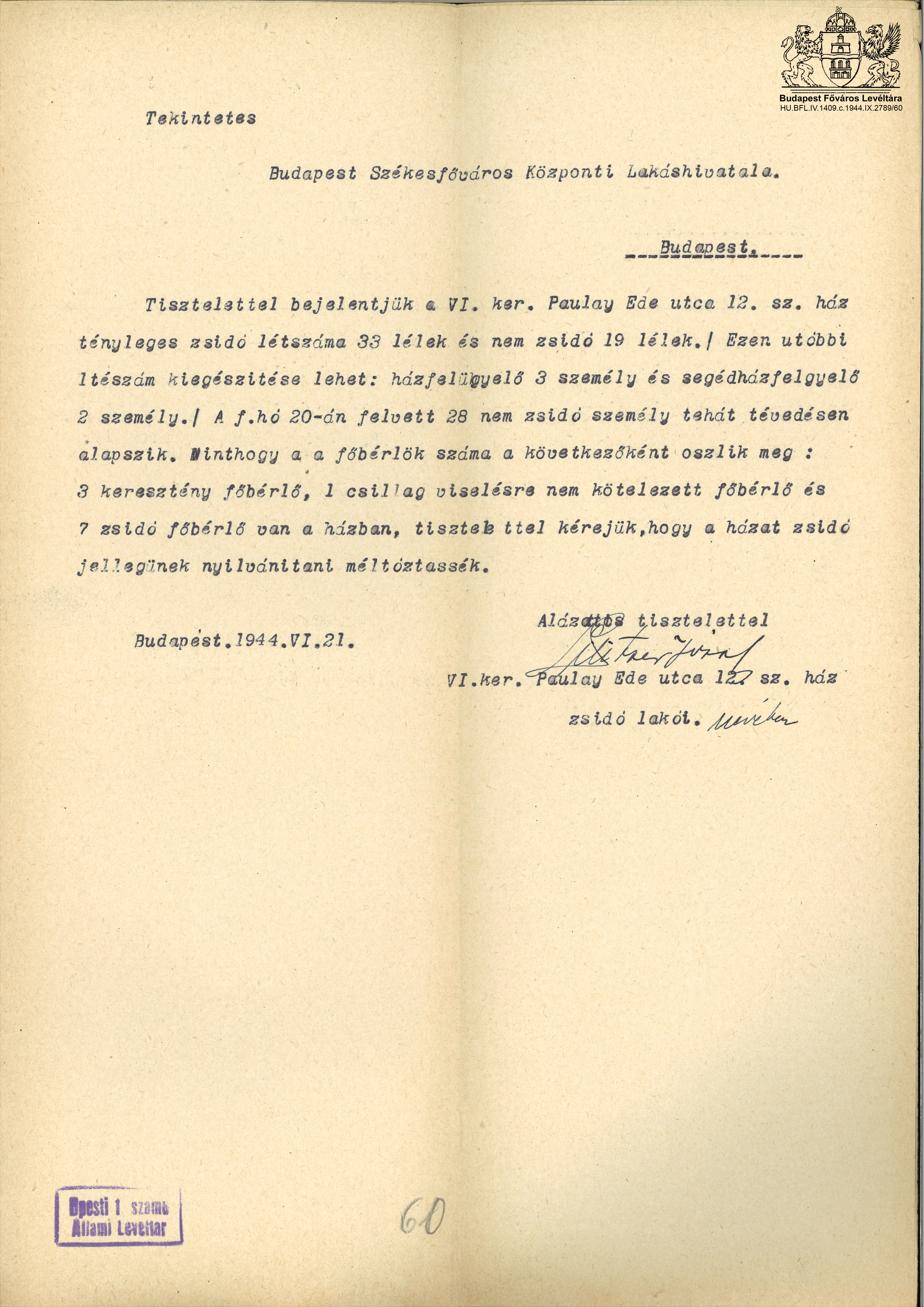 "... hogy mi maradhassunk és ők távozzanak" - Lakossági reakciók a csillagos házak kijelölésére PreviousNext Toggle image A VI. Paulay Ede u. 12. számú ház lakóinak kérelme Type of document kérelem Date of creation 1944.06.21 Collection Budapest Főváros Levéltára Related work "... hogy mi maradhassunk és ők távozzanak" - Lakossági reakciók a csillagos házak kijelölésére Reference code HU BFL IV.1409.c 2789/1944-IX. Letöltés PreviousNext