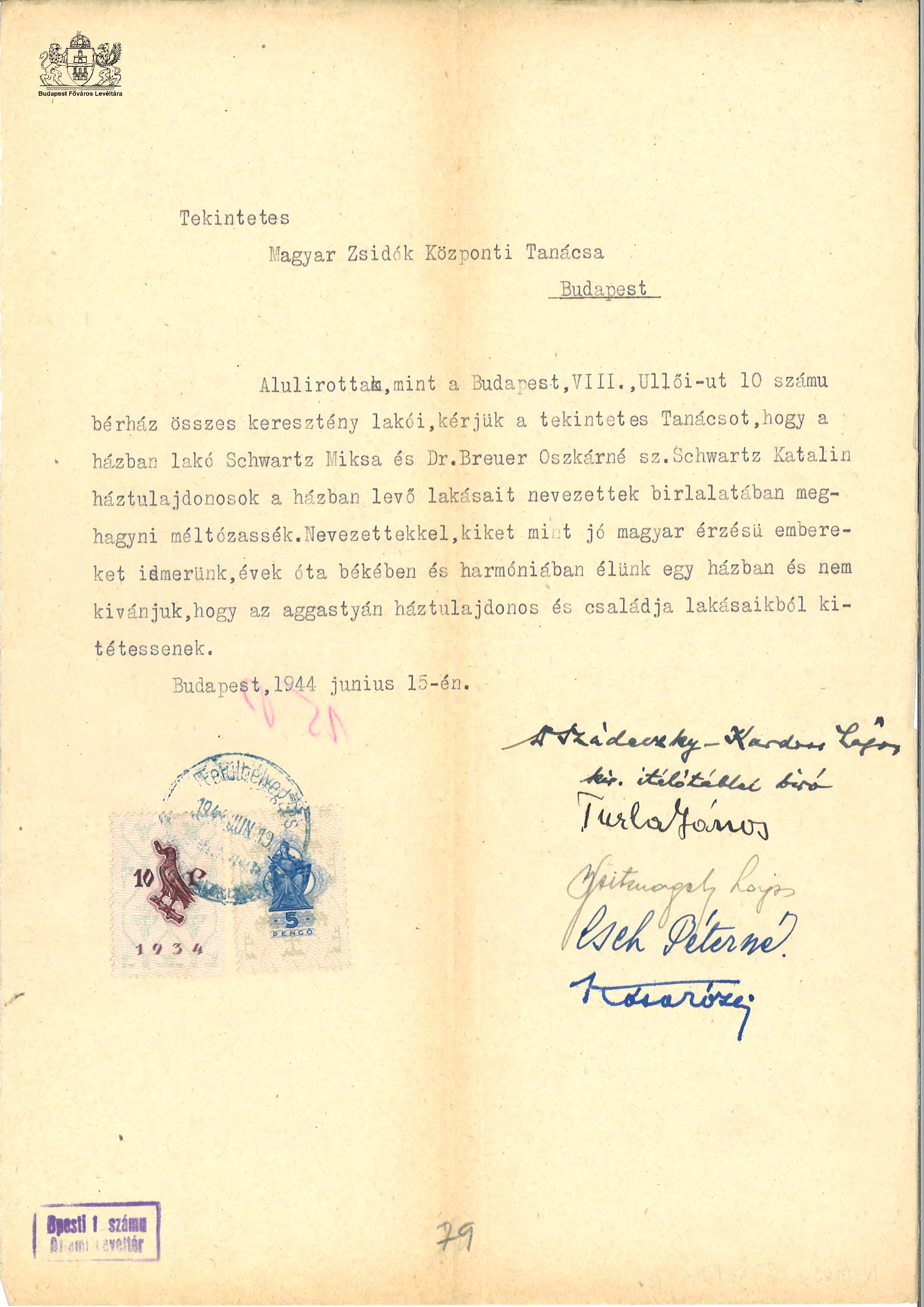 "... hogy mi maradhassunk és ők távozzanak" - Lakossági reakciók a csillagos házak kijelölésére PreviousNext Toggle image A VIII. Üllői őt 10. számú ház lakóinak kérelme Type of document kérelem Date of creation 1944.06.15 Collection Budapest Főváros Levéltára Related work "... hogy mi maradhassunk és ők távozzanak" - Lakossági reakciók a csillagos házak kijelölésére Reference code HU BFL IV.1409.c 2783/1944-IX. Letöltés PreviousNext