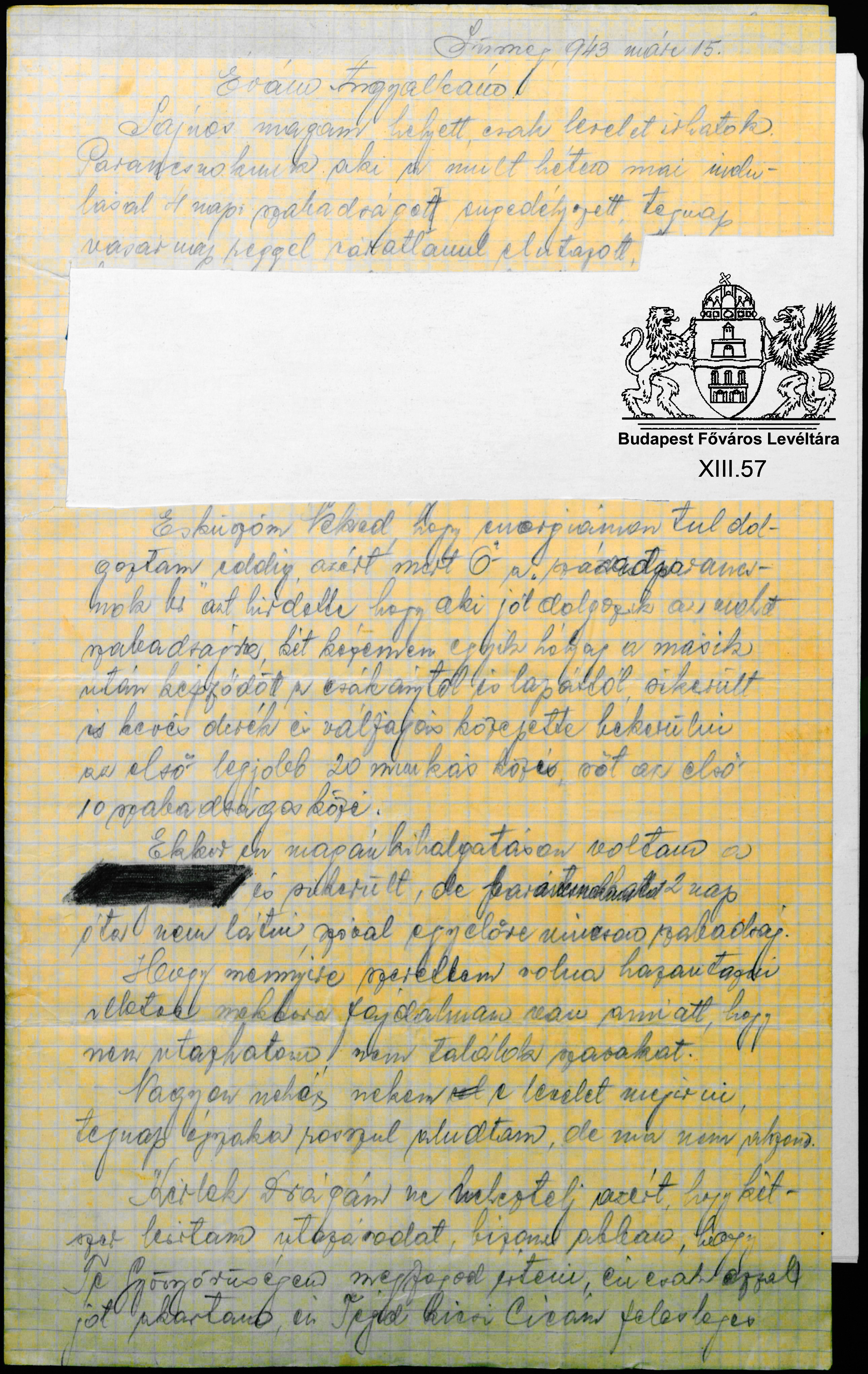 Weisz Hugó cenzúrázott levele feleségének, Bronner Évának a munkaszolgálat körülményeiről