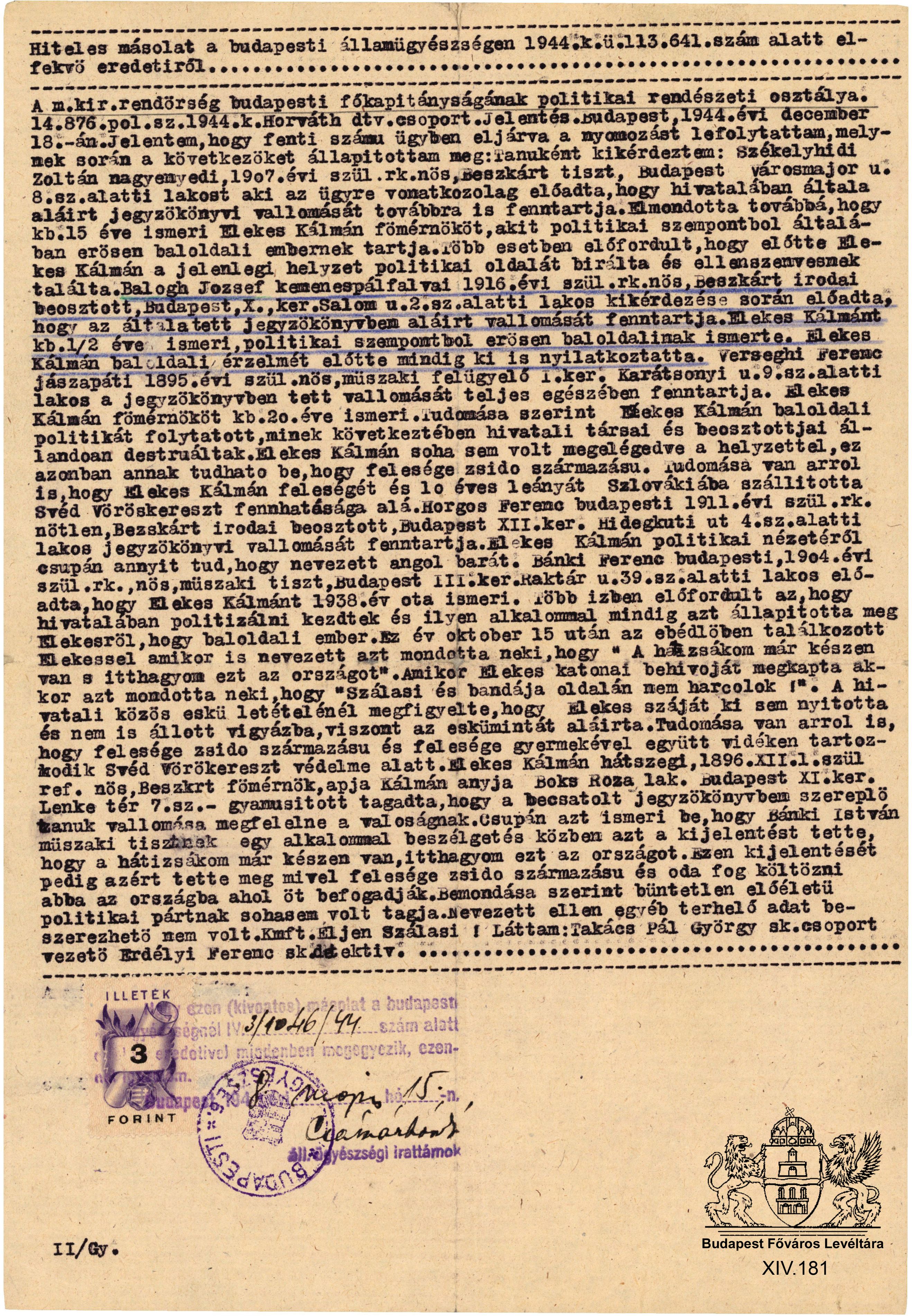 Rendőrségi nyomozati jelentés Elekes Kálmán politikai magatartása tárgyában