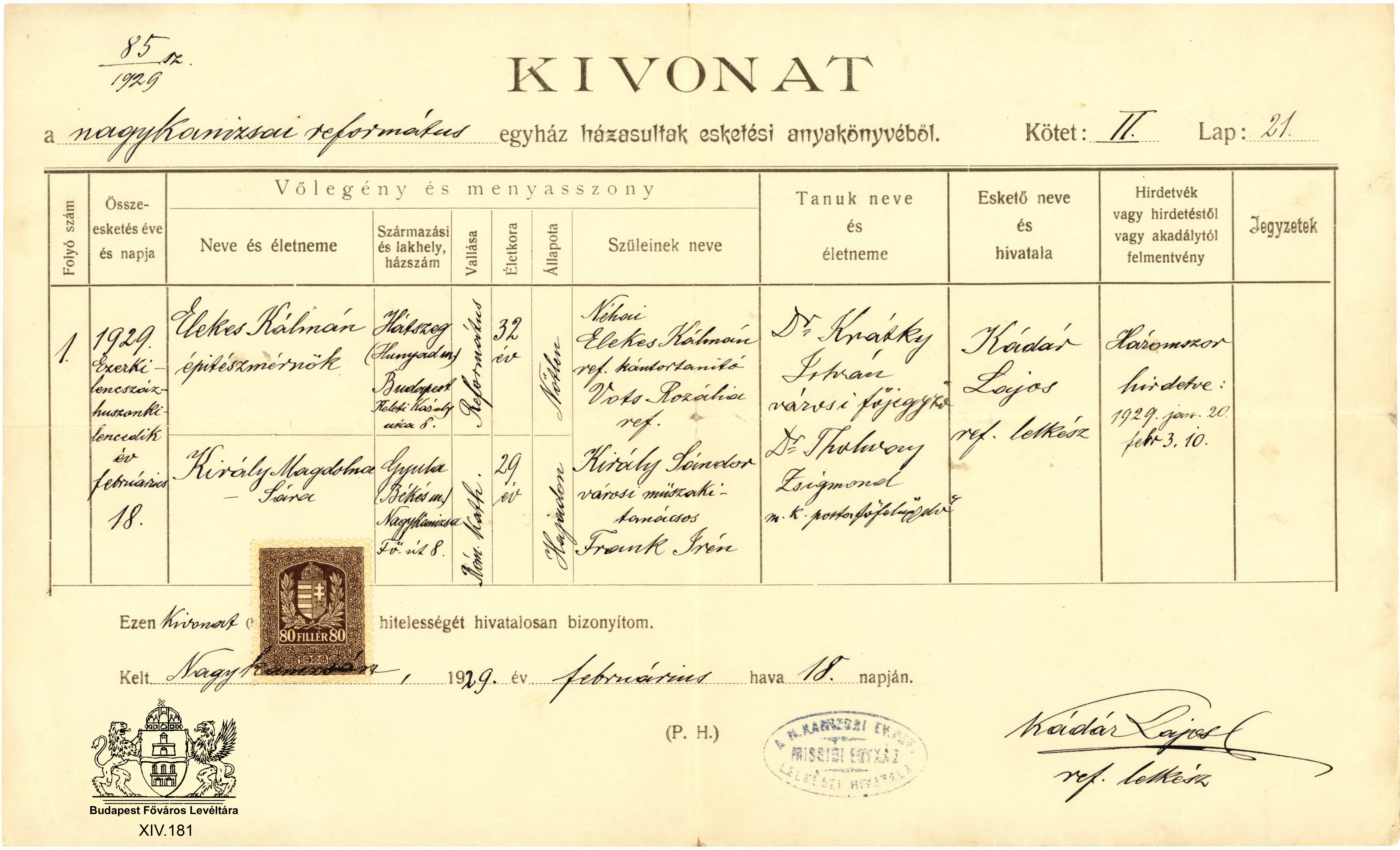 Egy vegyesházasság keletkezéstörténete Next Toggle image Elekes Kálmán és Király Magdolna házassági anyakönyvi kivonata Type of document anyakönyvi kivonat Date of creation 1929.02.18 Collection Budapest Főváros Levéltára Related work Egy vegyesházasság keletkezéstörténete Reference code XIV.181 Letöltés Next