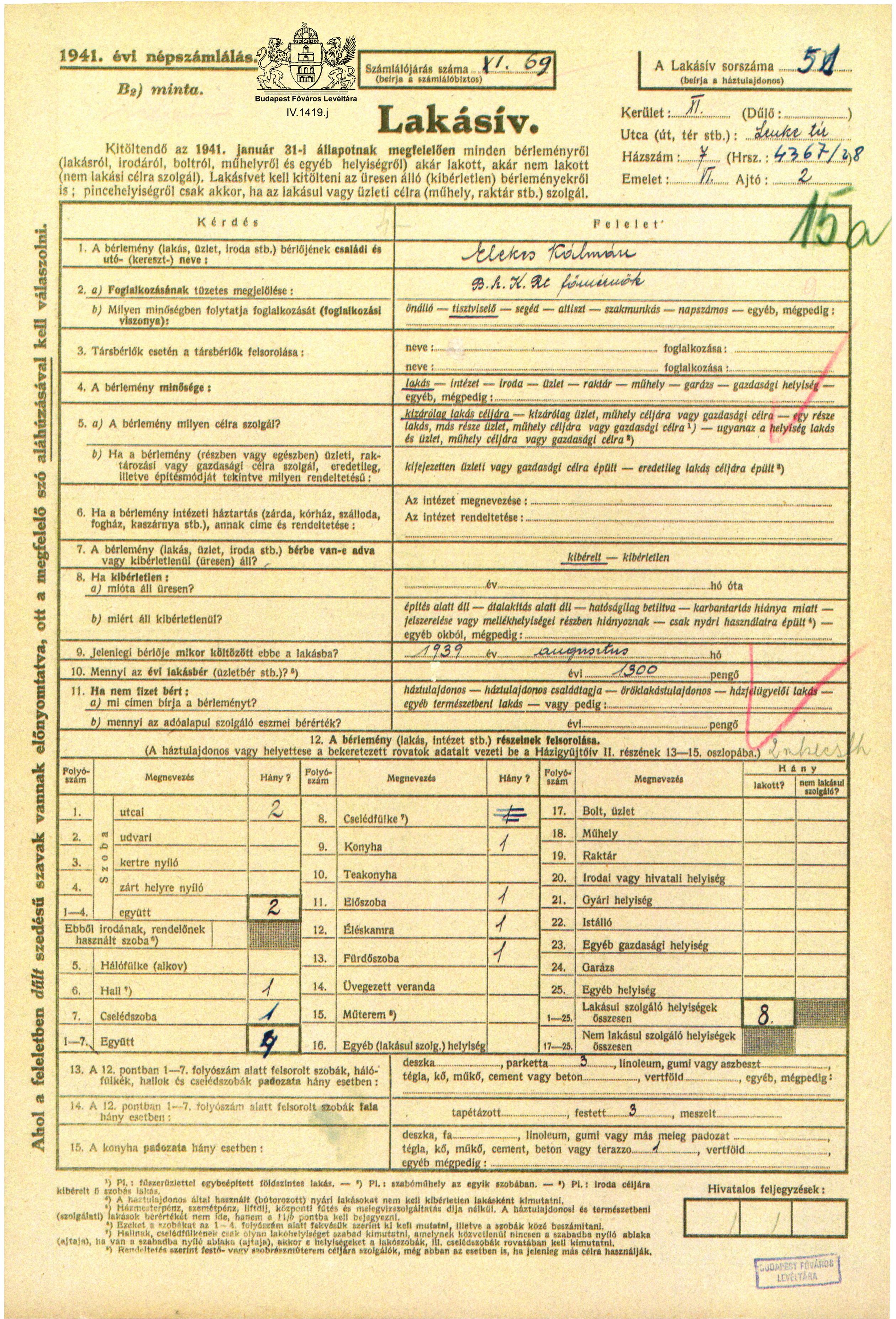 Az Elekes-Király család a városi térben Previous Toggle image Elekesék lakása: XI., Lenke tér 7., VI. em. 2. Bp. Szfv. Statisztikai Hivatala. 1941. évi népszámlálás lakásíve Type of document lakásív Date of creation 1941 Collection Budapest Főváros Levéltára Related work Az Elekes-Király család a városi térben Reference code IV.1419.j Letöltés Previous