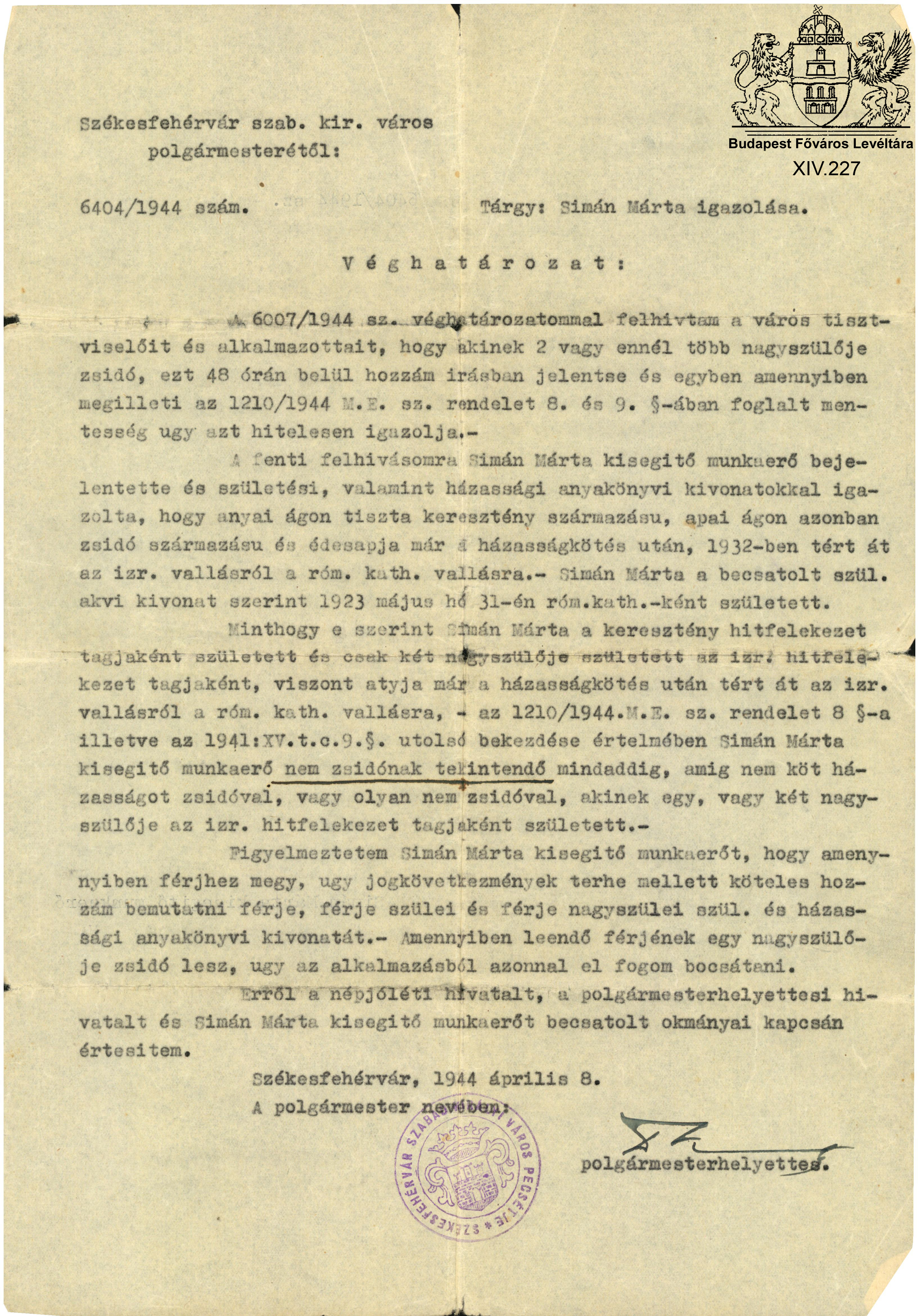 A munkaszolgálat változatai Next Toggle image Fejér István felesége, Simán Márta származási igazolása Type of document határozat Date of creation 1944 Collection Budapest Főváros Levéltára Related work A munkaszolgálat változatai Reference code XIV.227 Letöltés Next