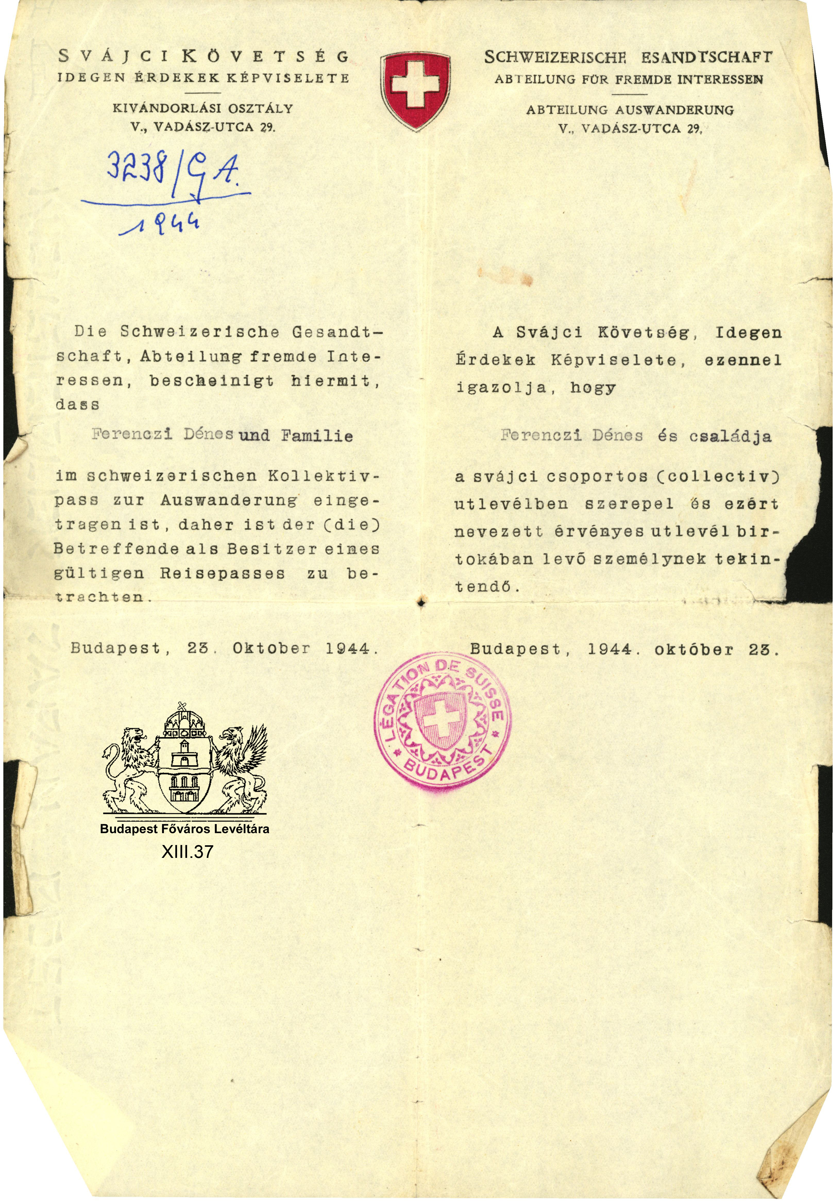 Régi katonák szokványos és kivételes esetei... Previous Toggle image Svájci követség védlevele Type of document védlevél Date of creation 1944.10.23 Collection Budapest Főváros Levéltára Related work Régi katonák szokványos és kivételes esetei... Reference code XIII.37 Letöltés Previous
