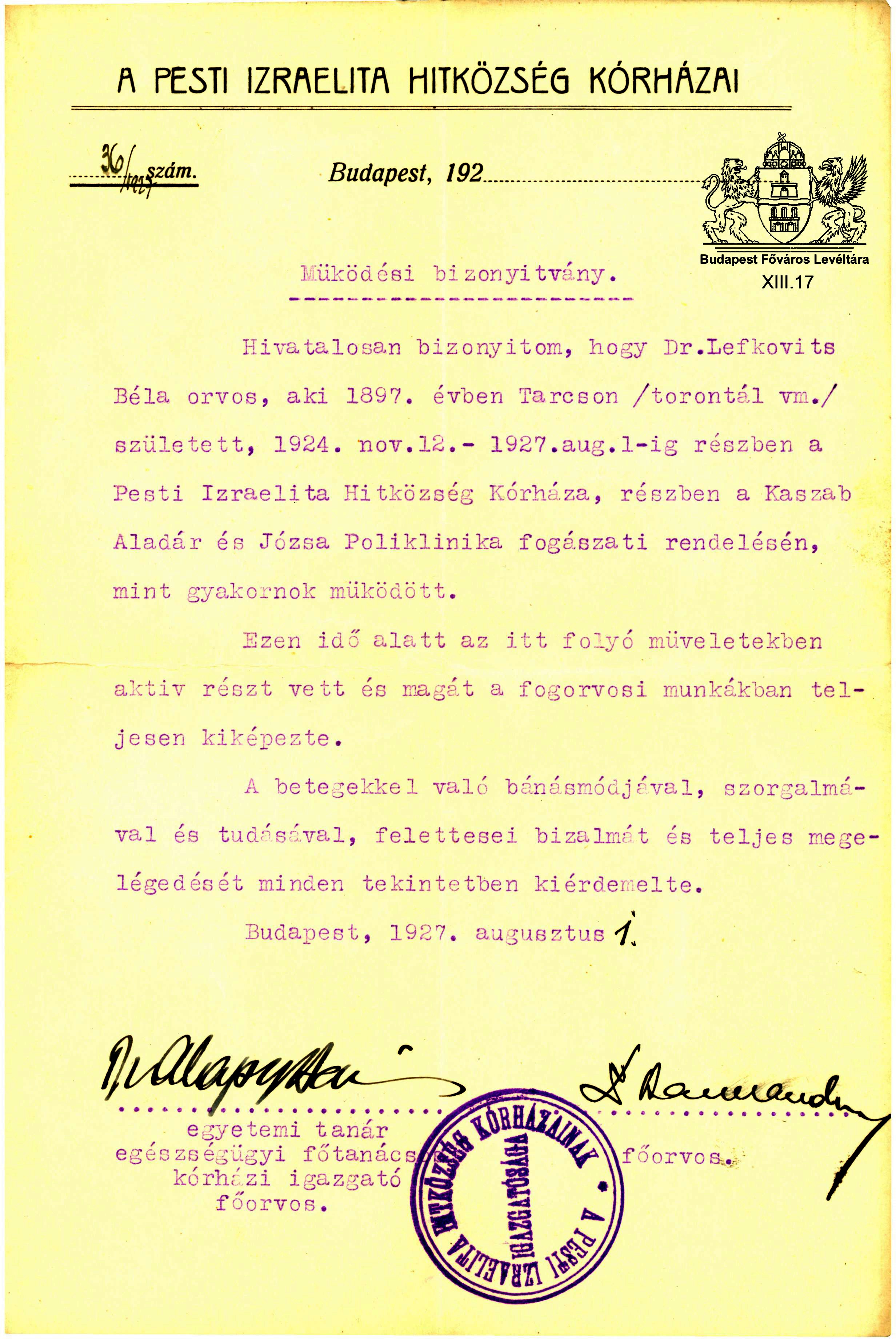 Fogorvosi gyakornoki működéséről kiállított bizonyítvány