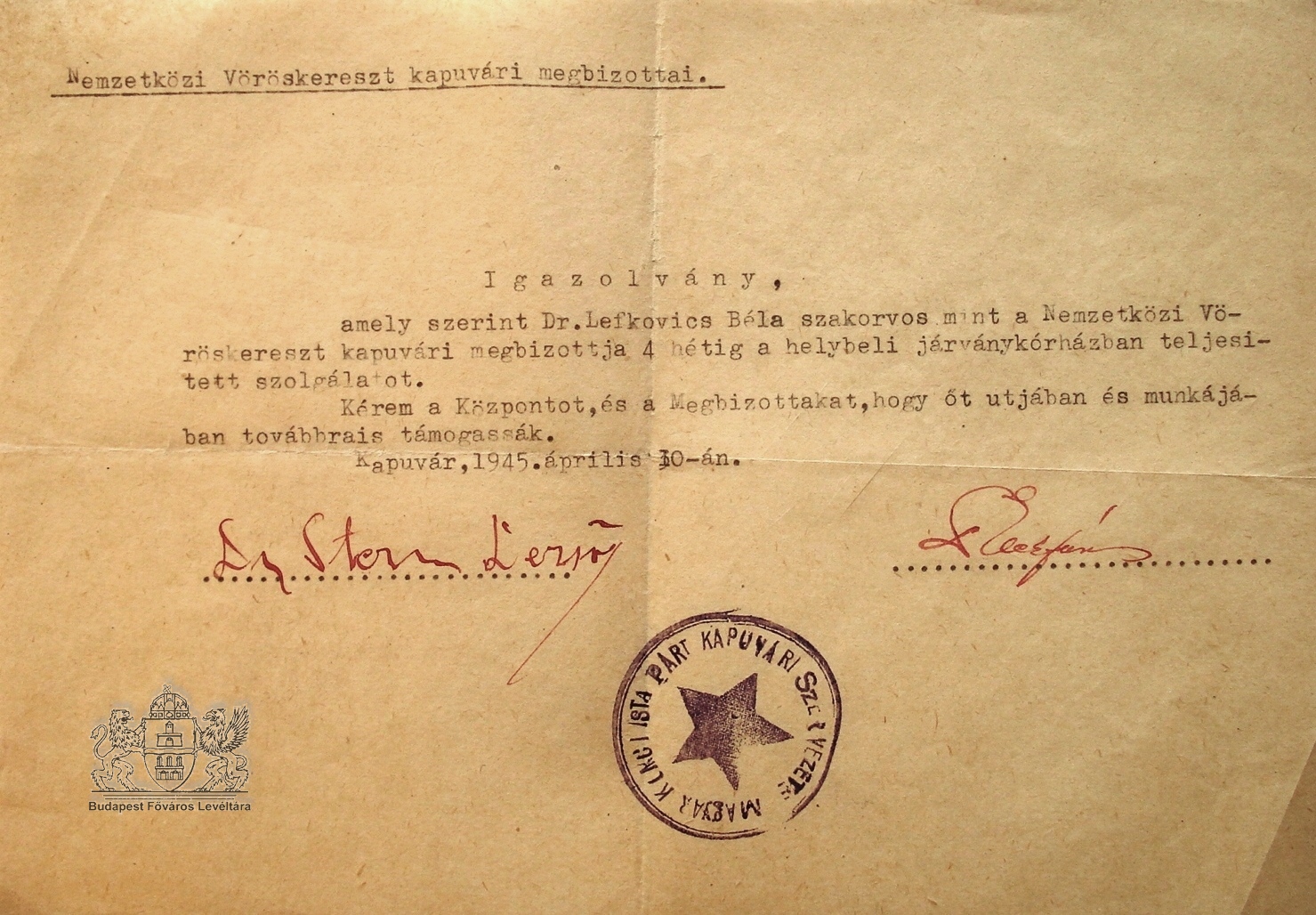 Vöröskereszt kapuvári megbízottjának igazolása járványkórházi munkáról