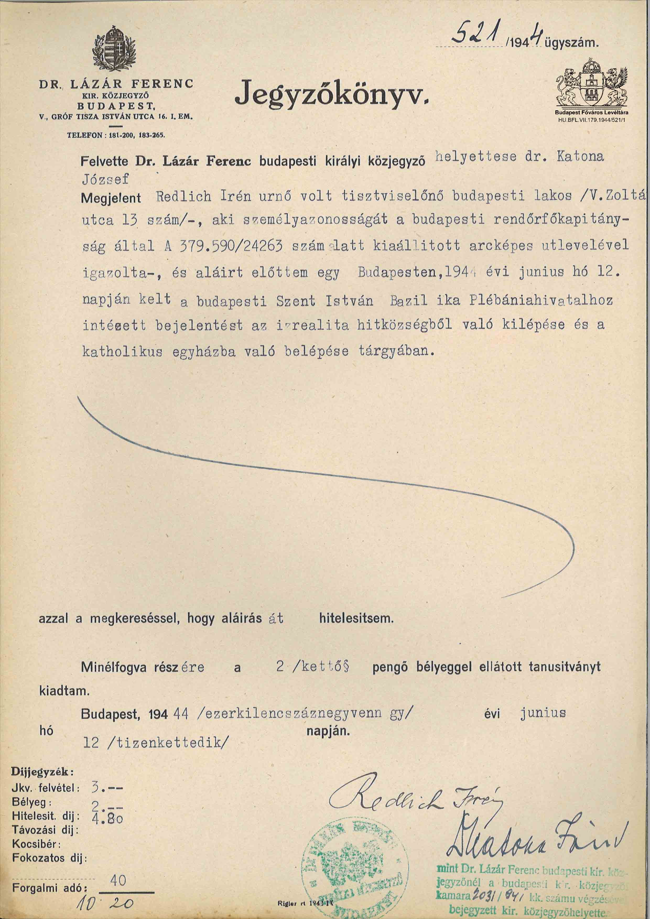 Az üldöztetés megjelenése a budapesti közjegyzők okirataiban, 1944 PreviousNext Toggle image Redlich Irén aláírásának hitelesítése katolikus vallásra való áttéréséről szóló nyilatkozaton Type of document közjegyzői okirat Date of creation 1944 Related work Az üldöztetés megjelenése a budapesti közjegyzők okirataiban, 1944 Reference code HU_BFL_VII_179_1944_521 Letöltés PreviousNext