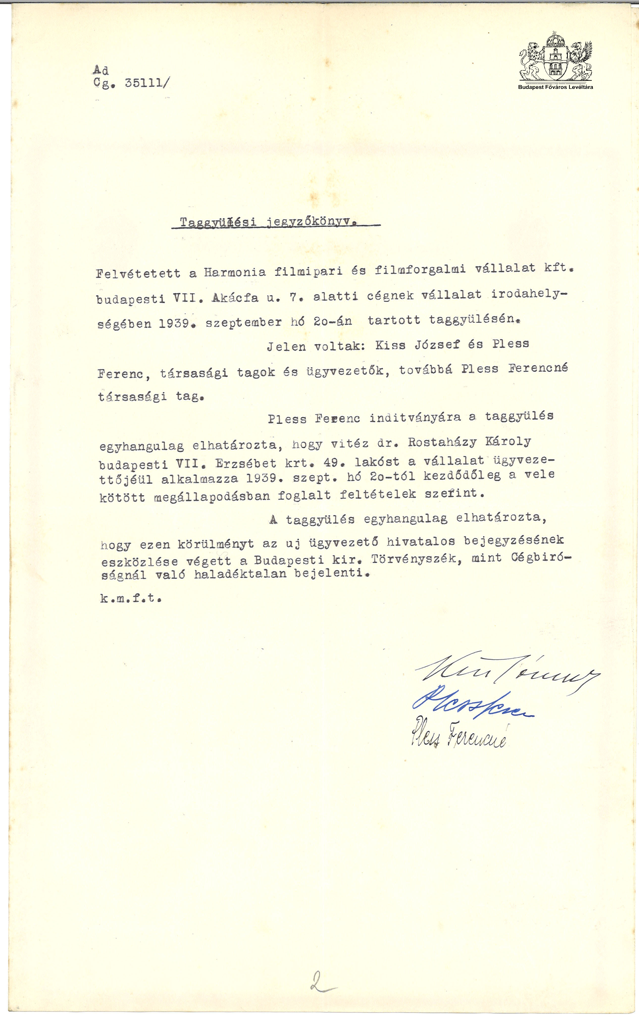 A zsidótörvények és rendeletek miatt eltiltották a szakmai tevékenységétől Pless Ferencet, ezért 1939. szeptember 20-ra összehívta a Harmonia cég taggyűlését. Ahol kinevezte vitéz Rostaházy Károlyt (1909-?) producert, hogy vezesse tovább a céget, majd 1941-ben báró Podmaniczky Félix (1914-1991) filmrendező lett az ügyvezető.