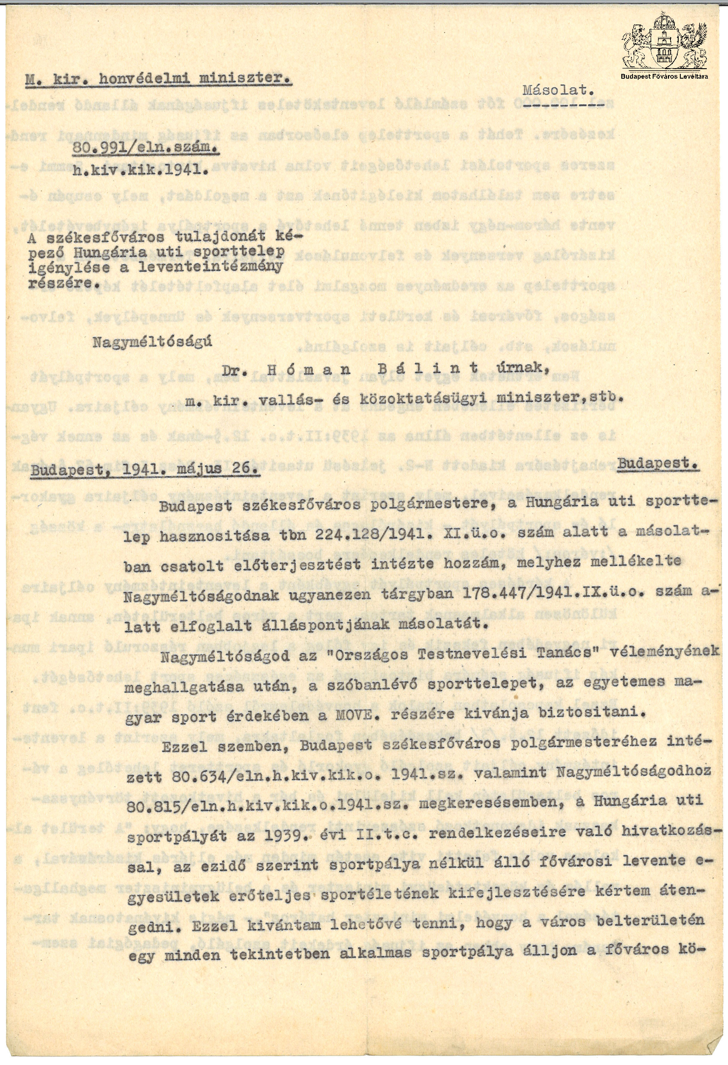 A Hungária úti sporttelep „igénylése” leventeintézmény céljaira