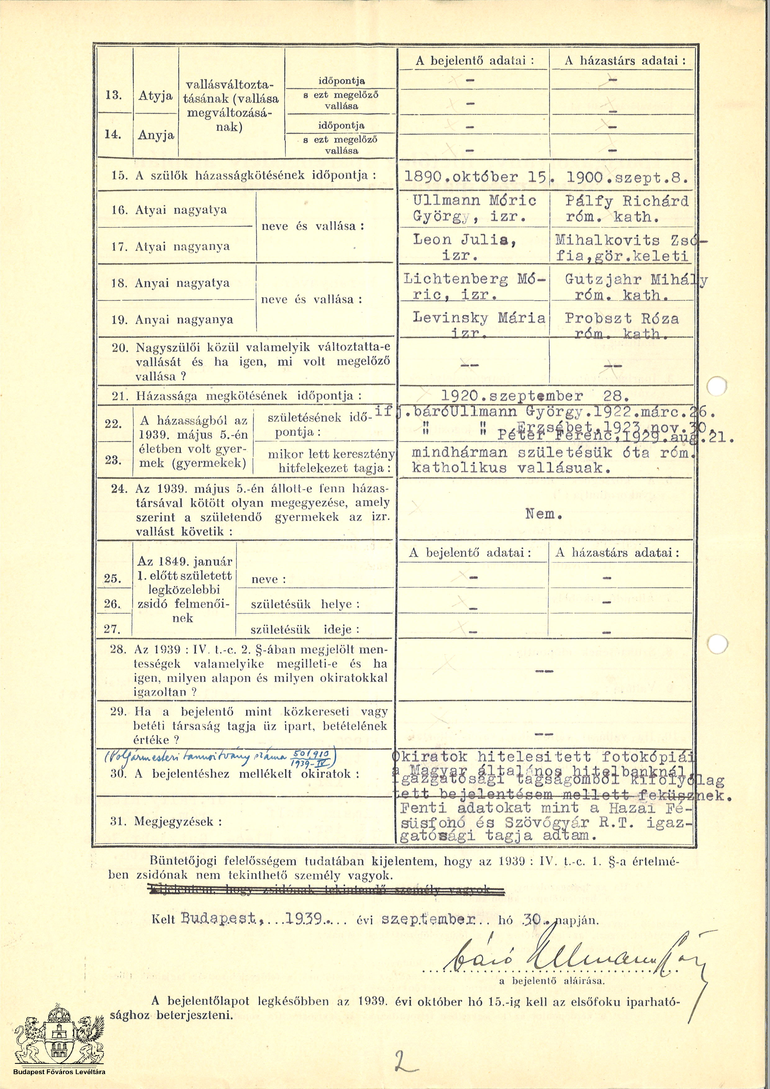 báró Ullmann György bejelentőlapja