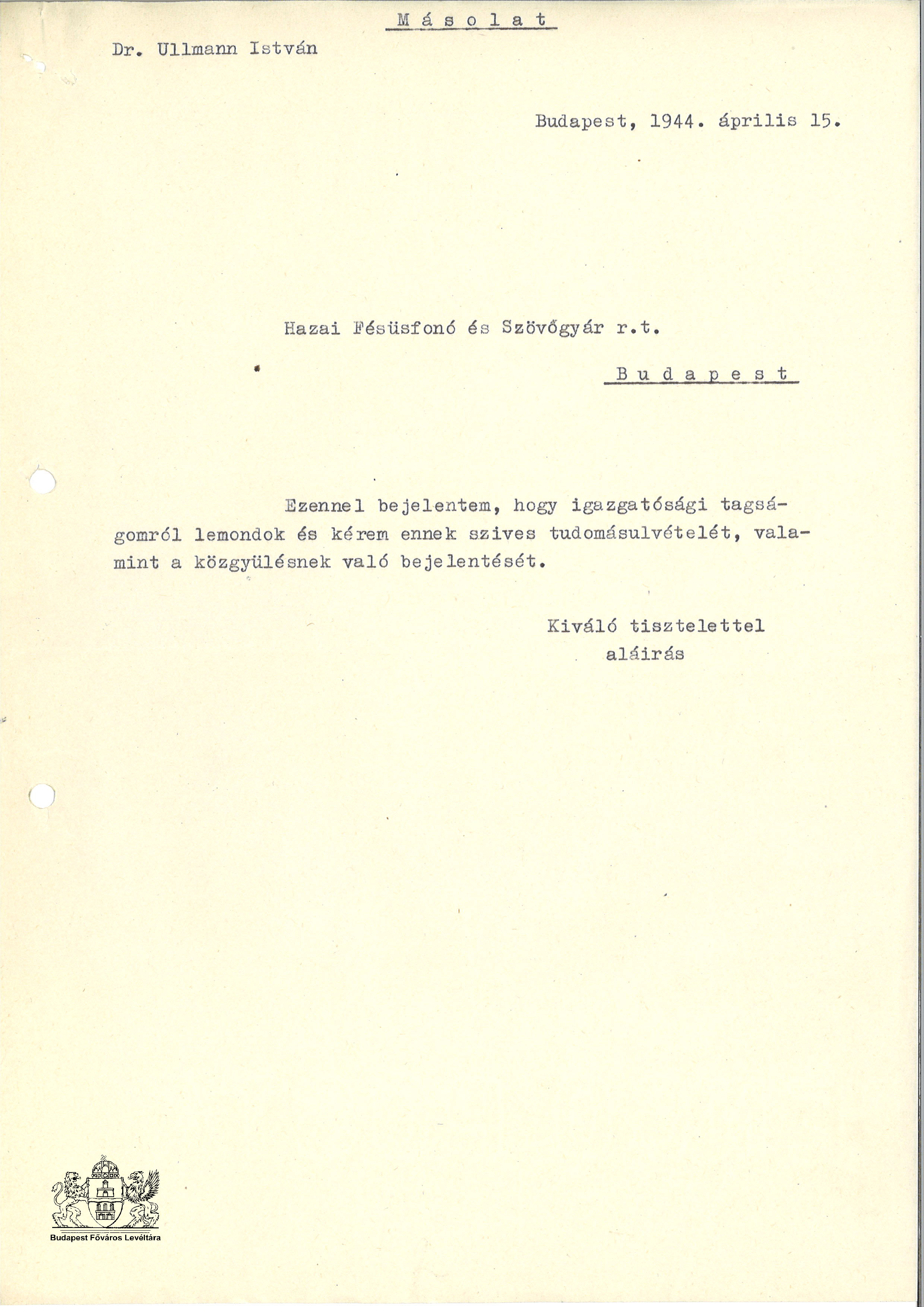 Zsidó származású gazdasági alkalmazottak Toggle image dr. Ullmann István lemondólevele Type of document levél Date of creation 1944.04.15 Related work Zsidó származású gazdasági alkalmazottak Reference code XI.533.d Letöltés