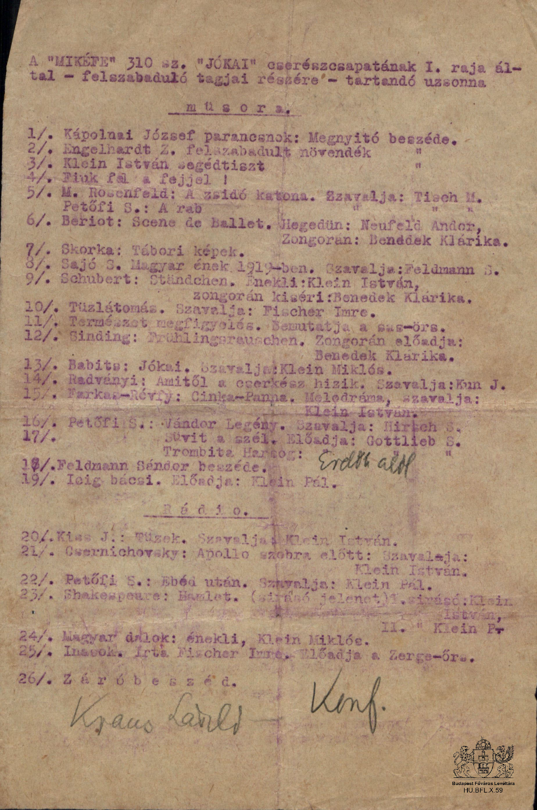 A MIKÉFE (Magyar Izraelita Kézmű- és Földművelési Egyesület) felszabaduló tanoncai számára rendezett műsoros uzsonna programja. Babits, Kiss József, Petőfi, Shakespeare, és Icig bácsi, minden amit a kultúráról gondoltak...