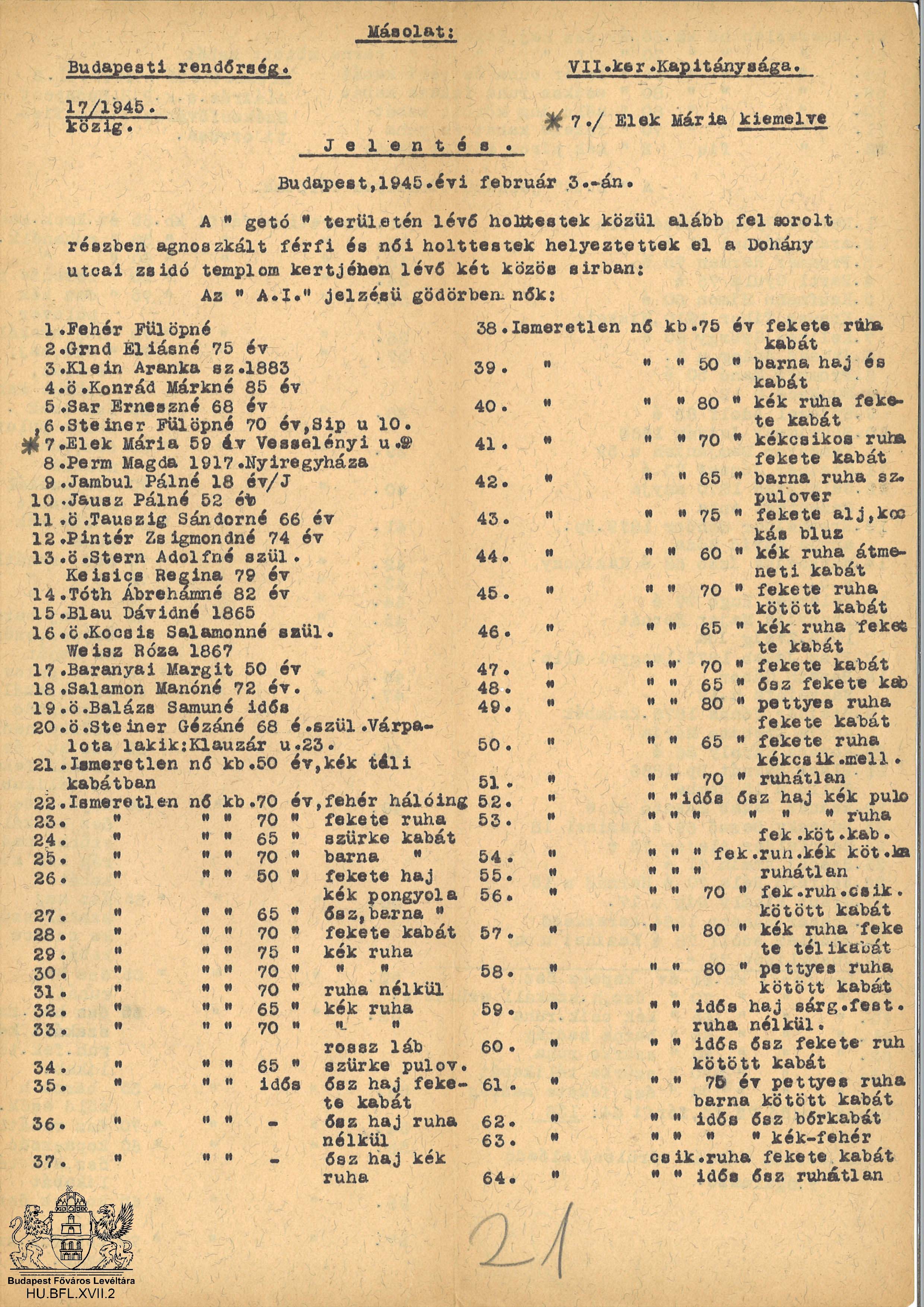 Tömegsírok - áldozatok névjegyzékei Next Toggle image A VII. kerületi rendőrkapitányság jelentése a gettó halottainak eltemetéséről a Dohány utcai zsinagóga kertjében 1. Type of document jelentés Date of creation 1945.02.03 Collection Budapest Főváros Levéltára Related work Tömegsírok - áldozatok névjegyzékei Reference code HU BFL XVII.2 36. csomó Letöltés Next