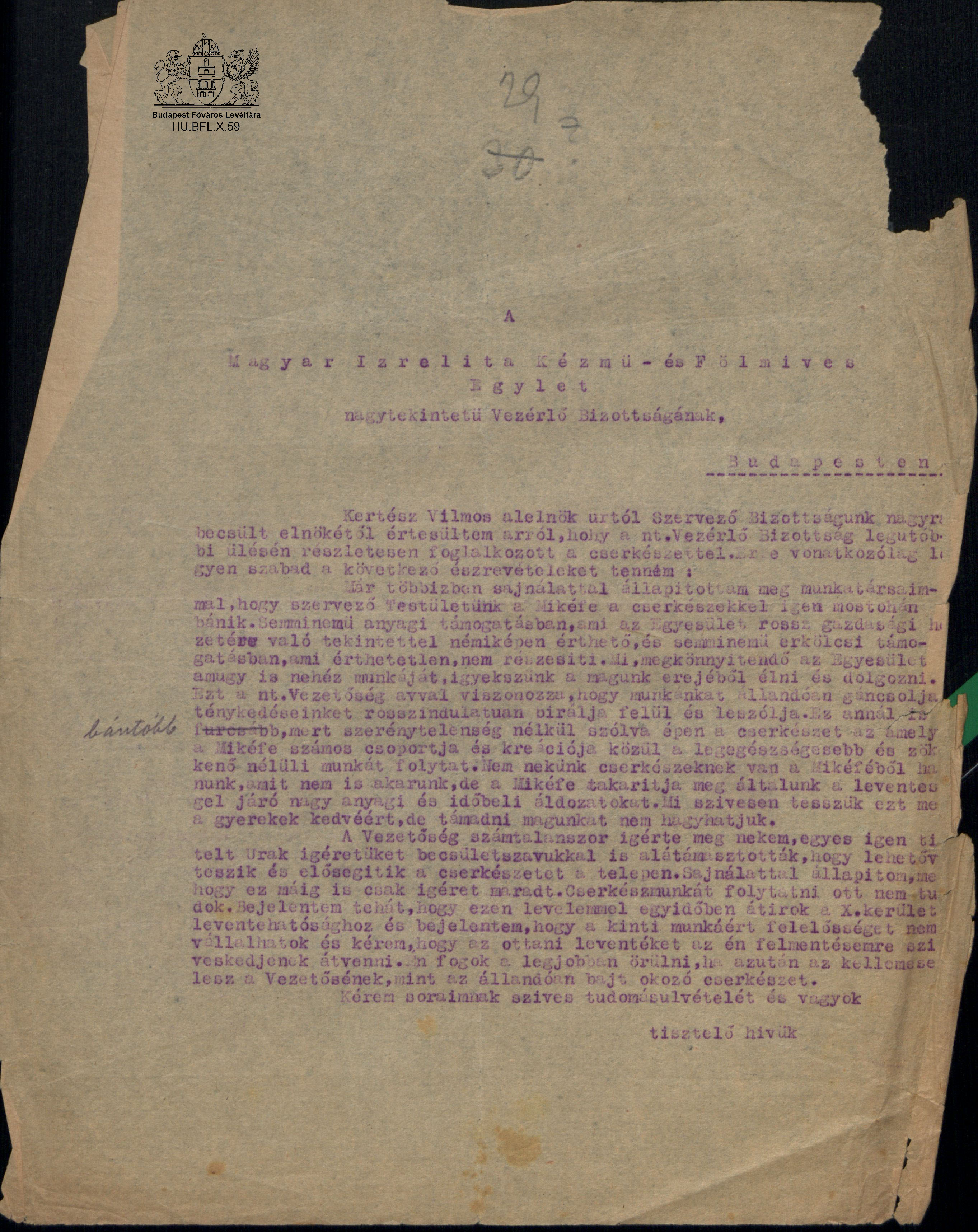 A 310-es Jókai Cserkészcsapat parancsnokának levele a MIKÉFE vezetőségéhez a levente képzés kapcsán kialakult helyzetről, a cserkészet gyenge támogatottságáról.Emiatt lemond a levente képzés cserkészeten belül fenntartásáról.