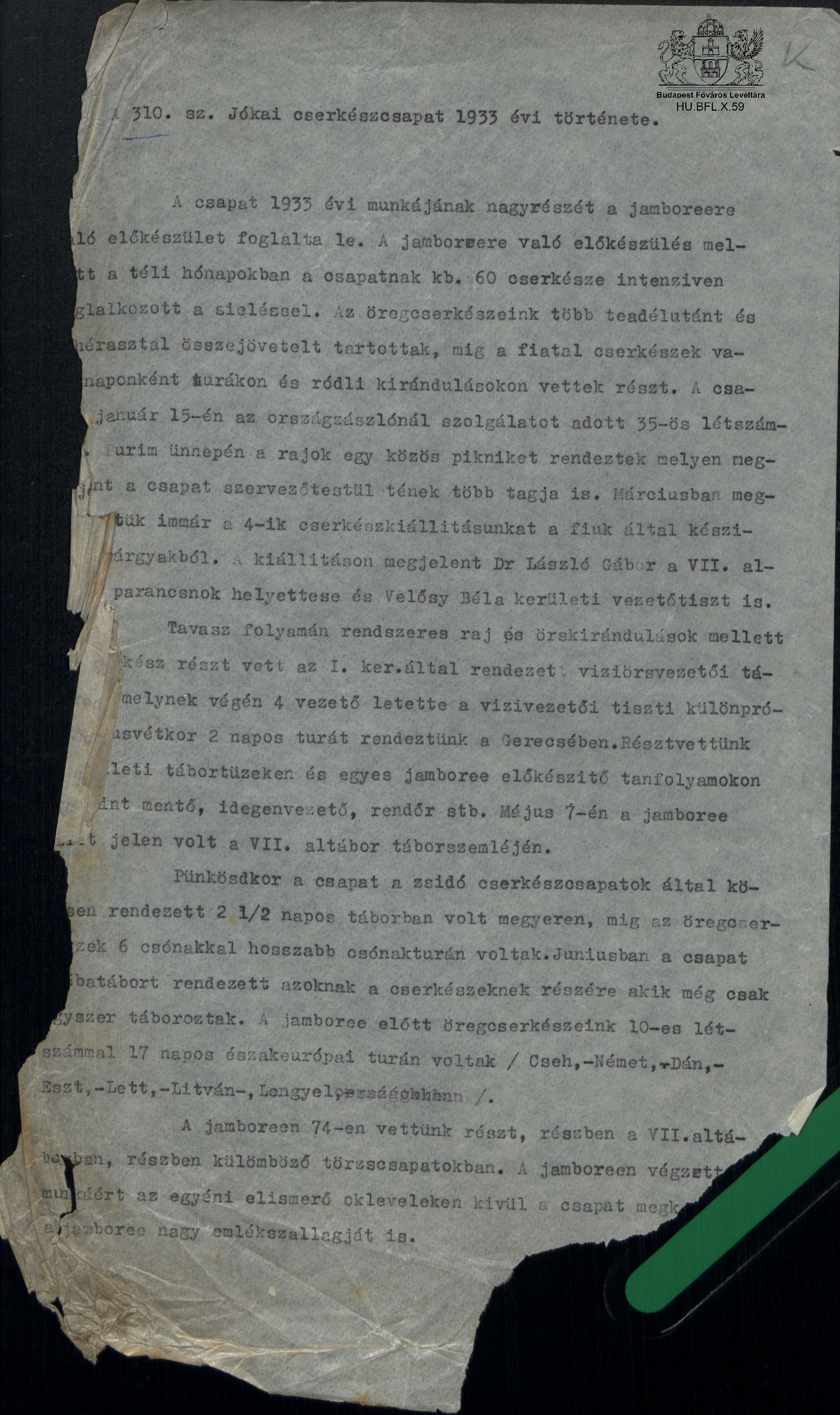A 310. Jókai Cserkészcsapat 1933. évi története