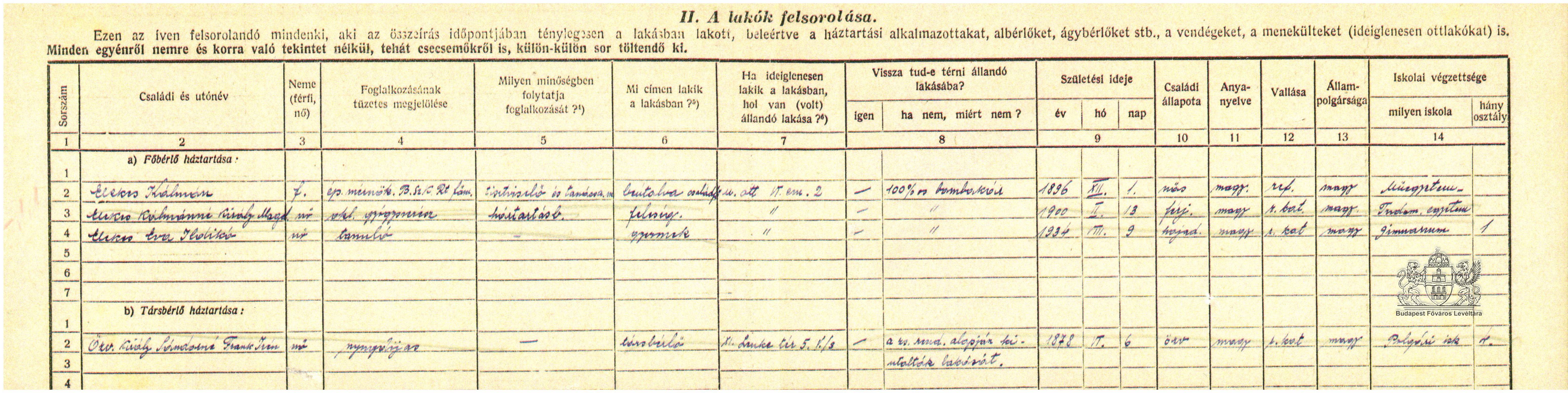 Az Elekes-Király család a városi térben PreviousNext Toggle image Az Elekeséknél lakók 1945-ben ( XI., Lenke tér 7. sz.) Dokumentum típusa lakásív Keletkezés ideje 1945 Őrzési hely Budapest Főváros Levéltára Vonatkozó alkotás Az Elekes-Király család a városi térben Jelzet IV.1419.j Letöltés PreviousNext