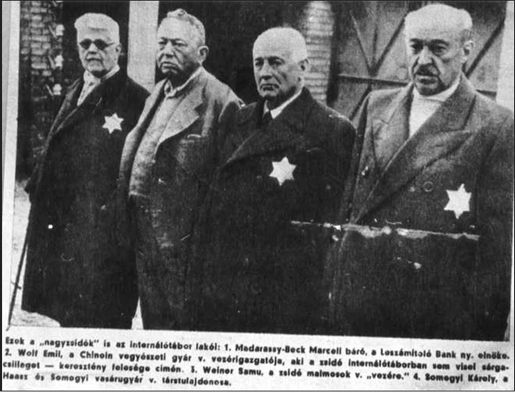 Báró Madarassy-Beck Marcell bankár (szemüvegben) és mellette Wolf Emil gyáros a kistarcsai internálótáborban.