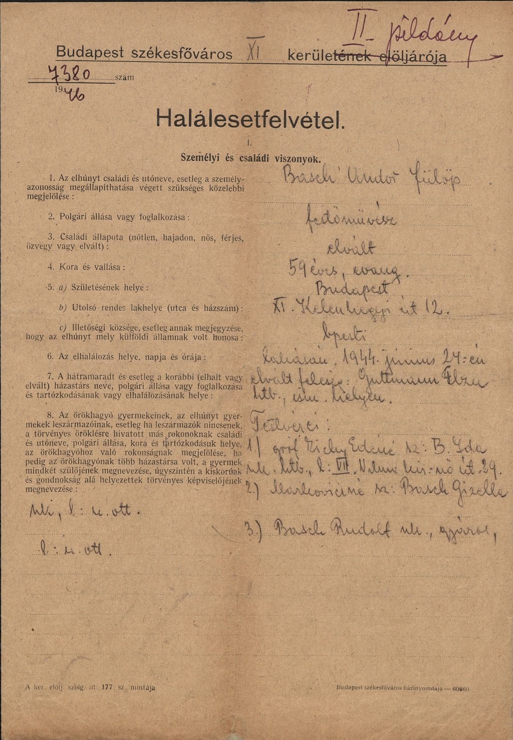 Falba zárt sorsok: XI. Kelenhegyi út 12-14. PreviousNext Toggle image Basch Andor halálesetfelvételi jegyzőkönyve 1. Dokumentum típusa Basch Andor Keletkezés ideje 1946.05.16 Őrzési hely Budapest Főváros Levéltára Vonatkozó alkotás Falba zárt sorsok: XI. Kelenhegyi út 12-14. Jelzet BFL IV.1411.b 333320/50 Letöltés PreviousNext