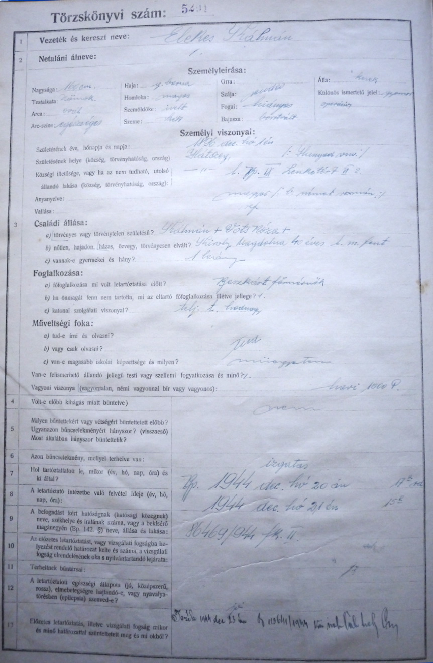 Az Elekes-Király család a városi térben Previous Toggle image Elekes Kálmán letartóztatásának dokumentuma Budapesti Kir. Büntetőtörvényszéki Fogház, fogolytörzskönyvi adat Dokumentum típusa nyilvántartás Keletkezés ideje 1944 Őrzési hely Budapest Főváros Levéltára Vonatkozó alkotás Az Elekes-Király család a városi térben Jelzet VII.102.a Letöltés Previous