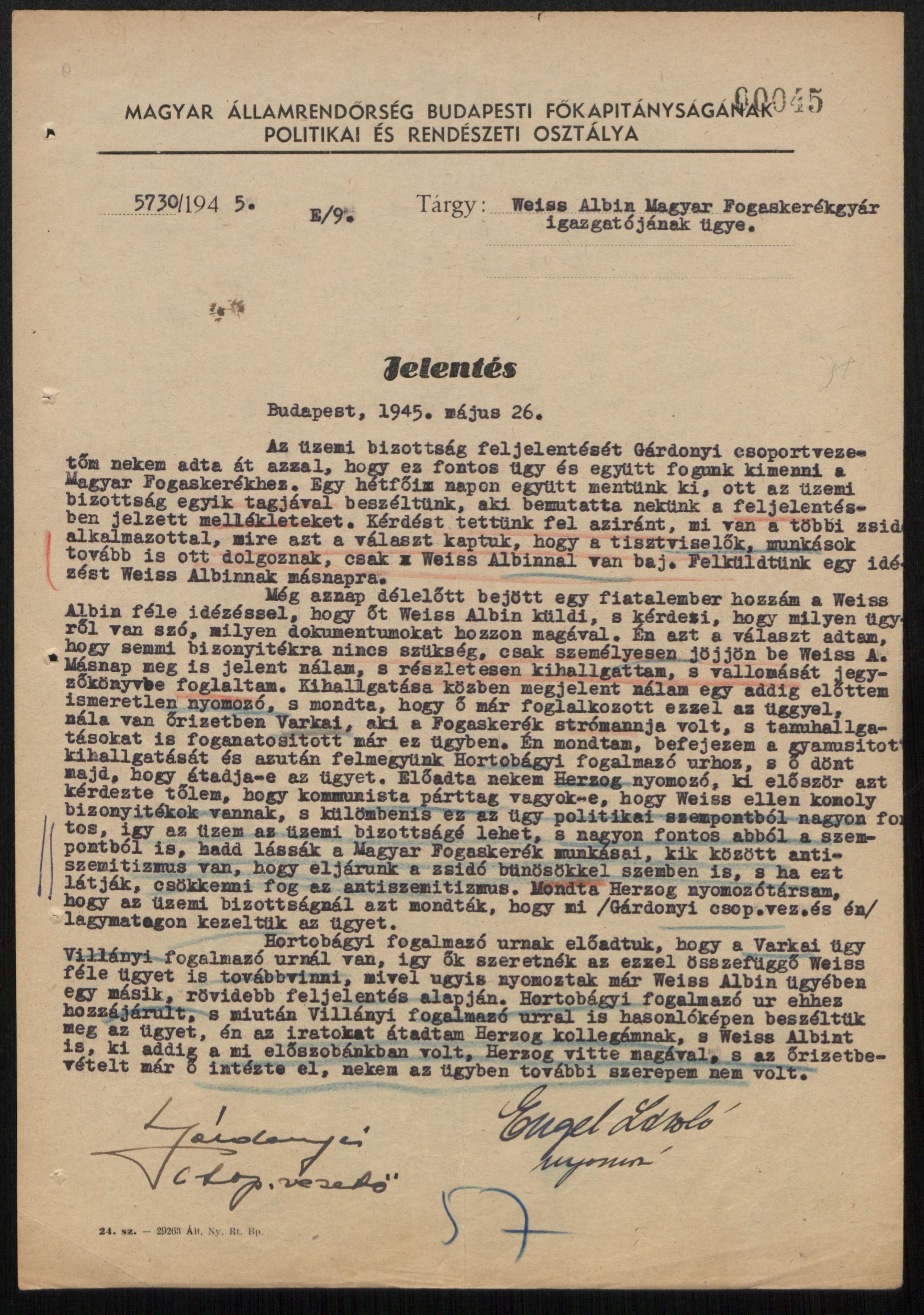 Engel László nyomozó jelentése Weisz Albin letartóztatásának körülményeiről