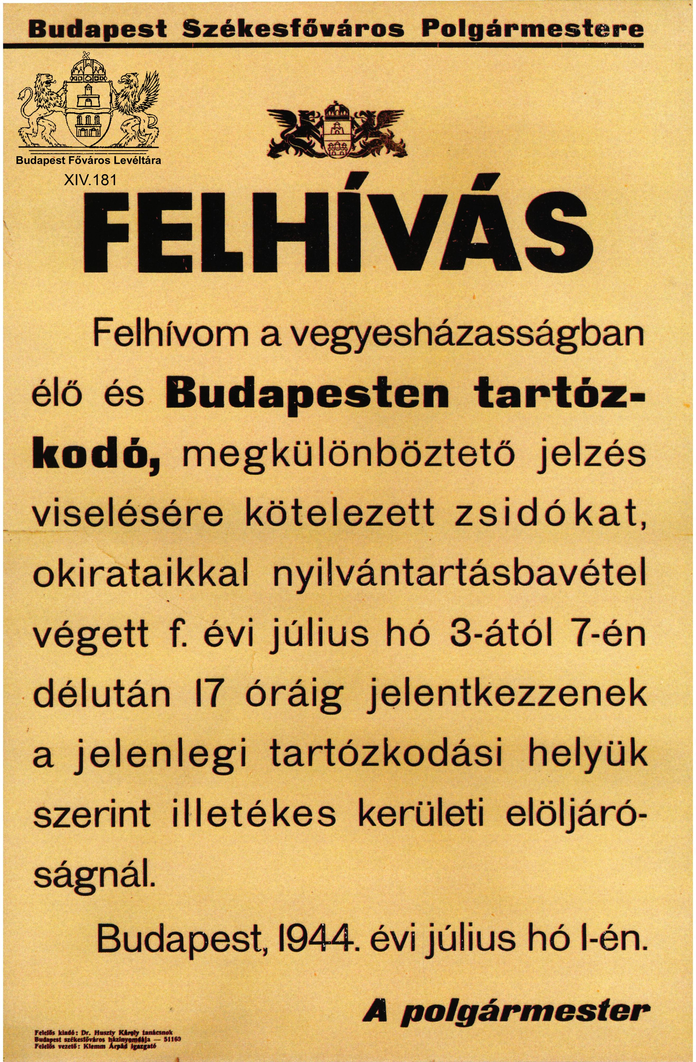 Felhívás vegyesházasságban élő zsidók hatóság előtti jelentkezésére