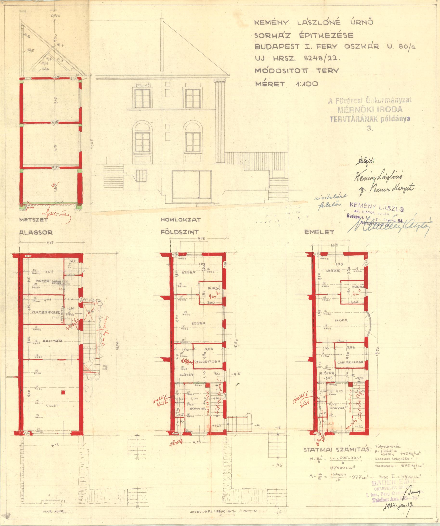 A Fery Oszkár utcában a családtagok tulajdonában álló telkeken és a házaspár vállalkozásában, mérnök vejeik közreműködésével több ház épült az 1920-as évektől – ezek közé tartozott az 56–80. szám alatti házcsoport, az első fővárosi sorházas telep. A terven szereplő ház építtetője Kemény Lászlóné Bauer Margit és a kivitelért felelős Kemény László a tervező Bauer Emil leánya, illetve veje.