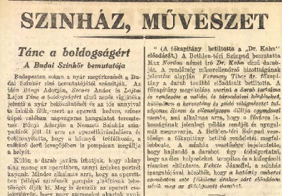 Az „asszimiláció szomorújátéka" - a Doktor Kohn című színdarab betiltása. Next Toggle image A főkapitány betiltotta a „Dr. Kohn" előadását. Budapesti Hírlap Színház, művészet rovat Dokumentum típusa hírlapi cikk Keletkezés ideje 1933.06.17 Őrzési hely Budapesti Hírlap Vonatkozó alkotás Az „asszimiláció szomorújátéka" - a Doktor Kohn című színdarab betiltása. Jelzet - Letöltés Next