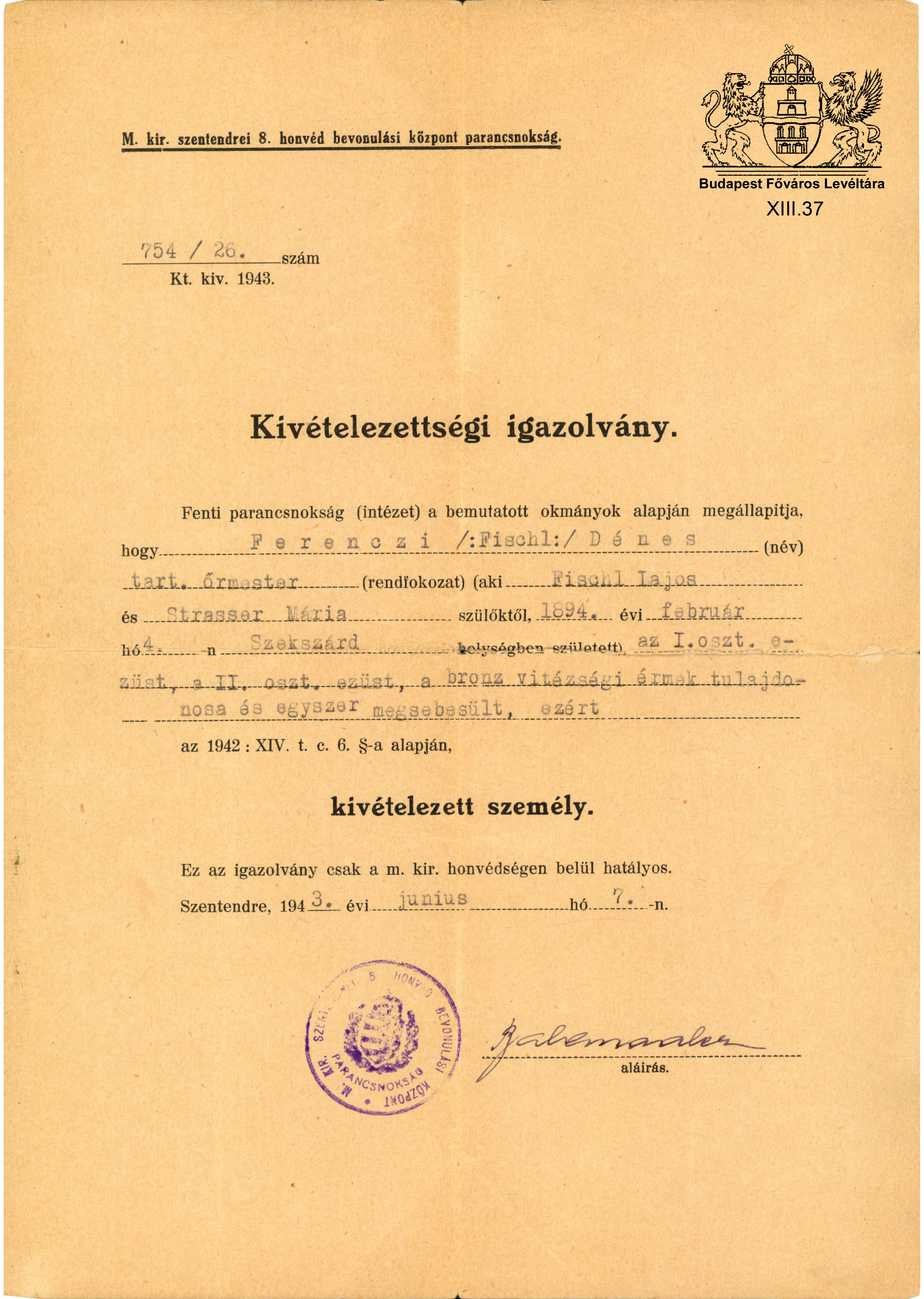 Régi katonák szokványos és kivételes esetei... Previous Toggle image Honvédparancsnokság kivételezettségi igazolványa Dokumentum típusa igazolás Keletkezés ideje 1943.06.07 Őrzési hely Budapest Főváros Levéltára Vonatkozó alkotás Régi katonák szokványos és kivételes esetei... Jelzet XIII.37 Letöltés Previous