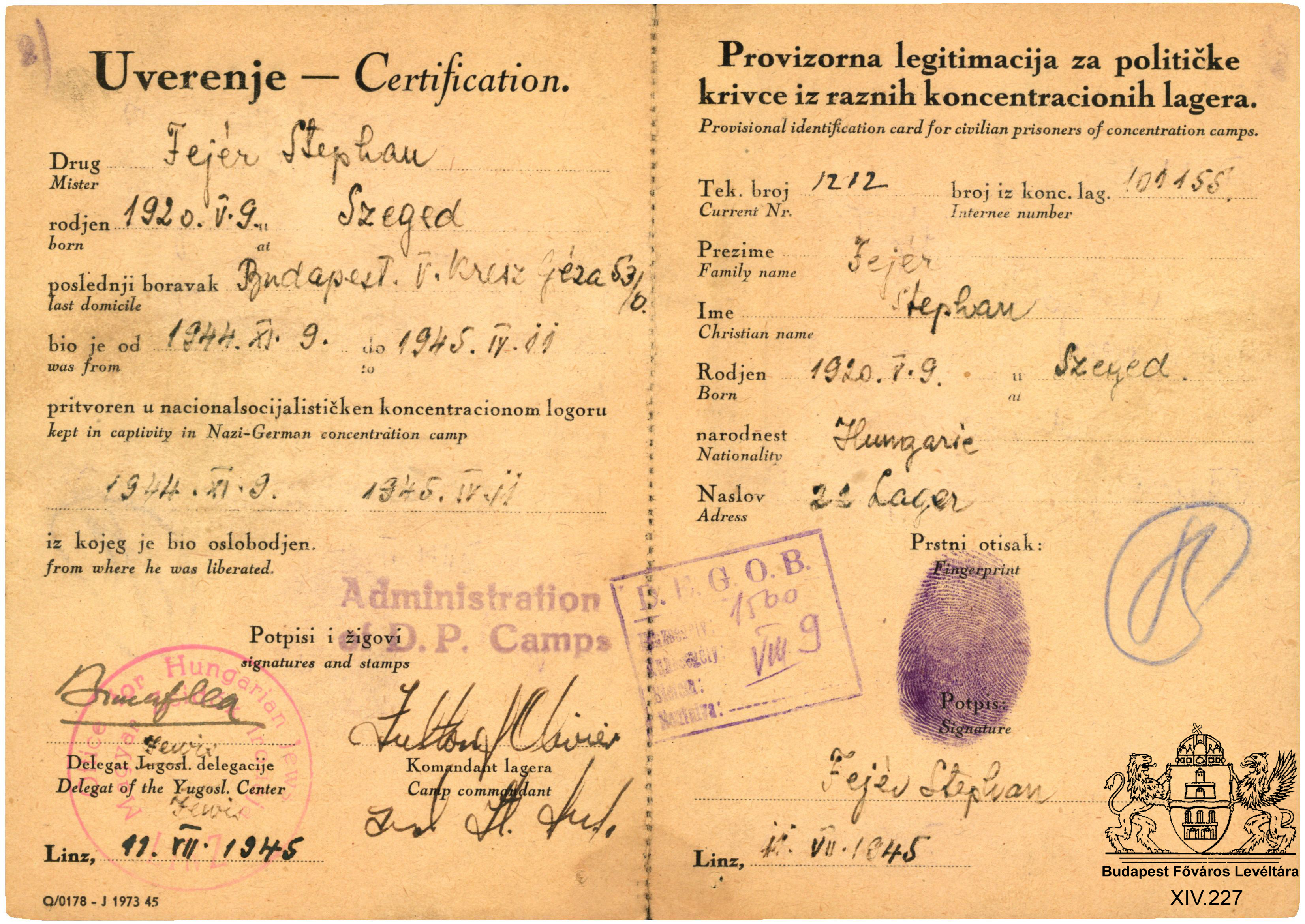 A munkaszolgálat változatai PreviousNext Toggle image Láger-foglyok számára rendszeresített személyazonossági igazolvány Dokumentum típusa igazolvány Keletkezés ideje 1945 Őrzési hely Budapest Főváros Levéltára Vonatkozó alkotás A munkaszolgálat változatai Jelzet XIV.227 Letöltés PreviousNext