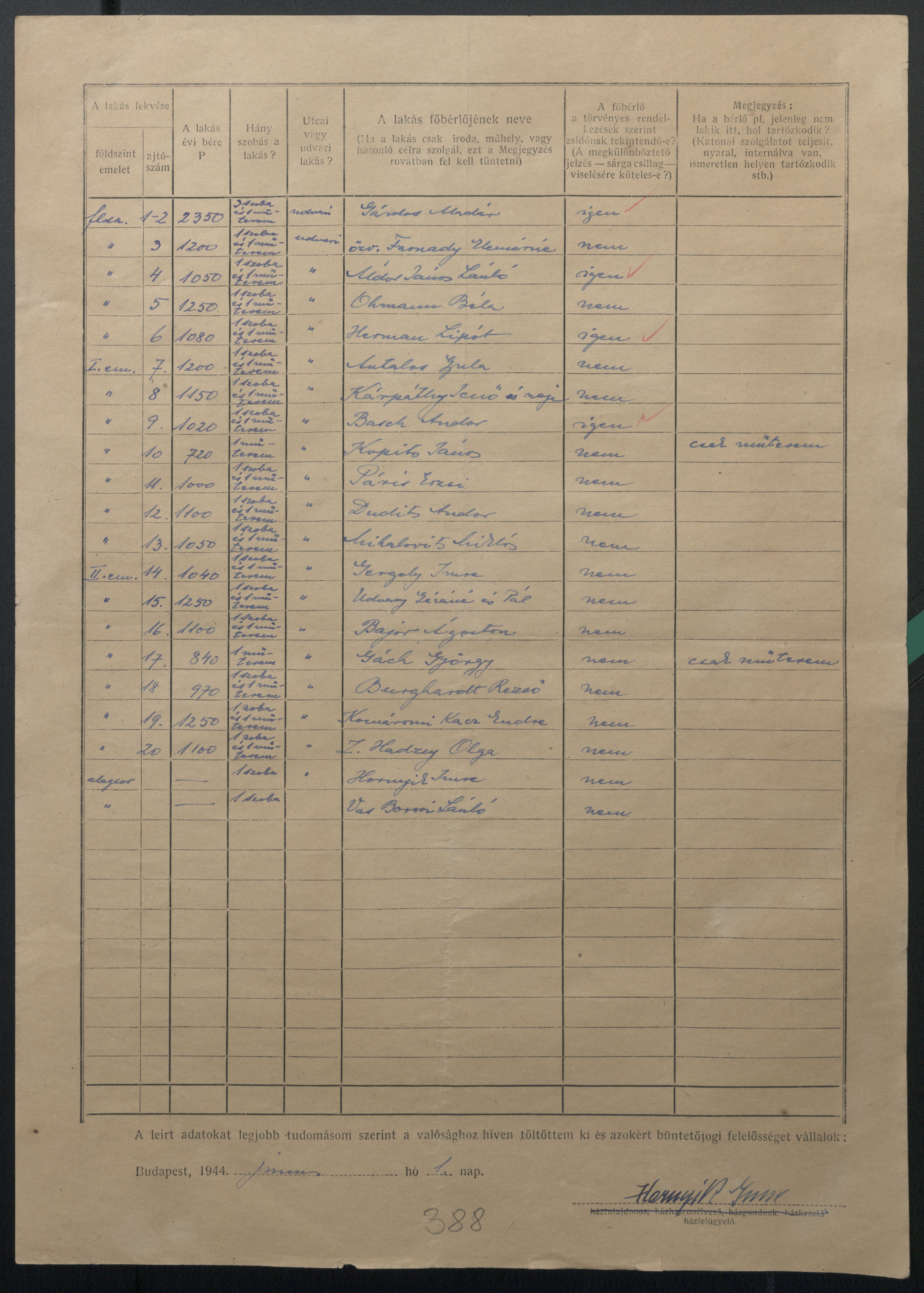 Az adatszolgáltatási ív felvétele idején, 1944 júniusában a Kelenhegyi úti műterem-bérházban négy zsidónak minősülő személy lakott: Gárdos Aladár, Áldor János László, Hermann Lipót és Basch Andor. közülük csak Hermann Lipót élte túl az üldöztetés időszakát.