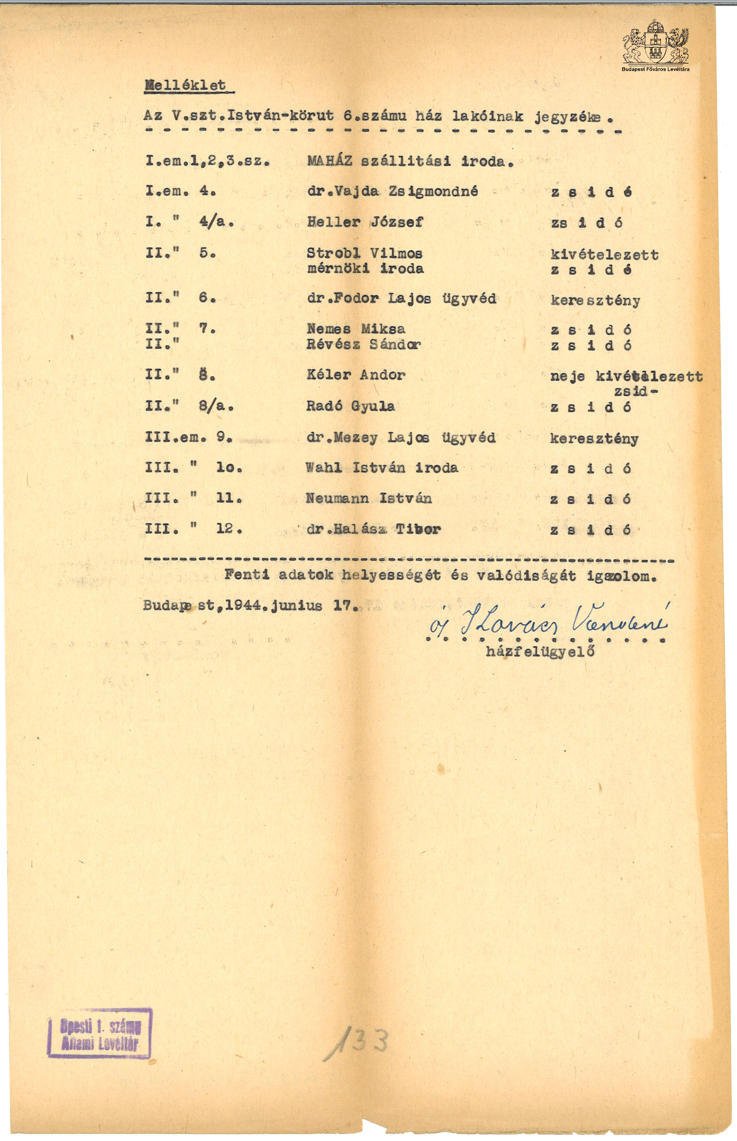 "... hogy mi maradhassunk és ők távozzanak" - Lakossági reakciók a csillagos házak kijelölésére PreviousNext Toggle image Lakónévsor (V. Szent István krt. 6.) Dokumentum típusa kérelem Keletkezés ideje 1944.06.17 Őrzési hely Budapest Főváros Levéltára Vonatkozó alkotás "... hogy mi maradhassunk és ők távozzanak" - Lakossági reakciók a csillagos házak kijelölésére Jelzet HU BFL IV.1409.c 2786/1944-IX. Letöltés PreviousNext