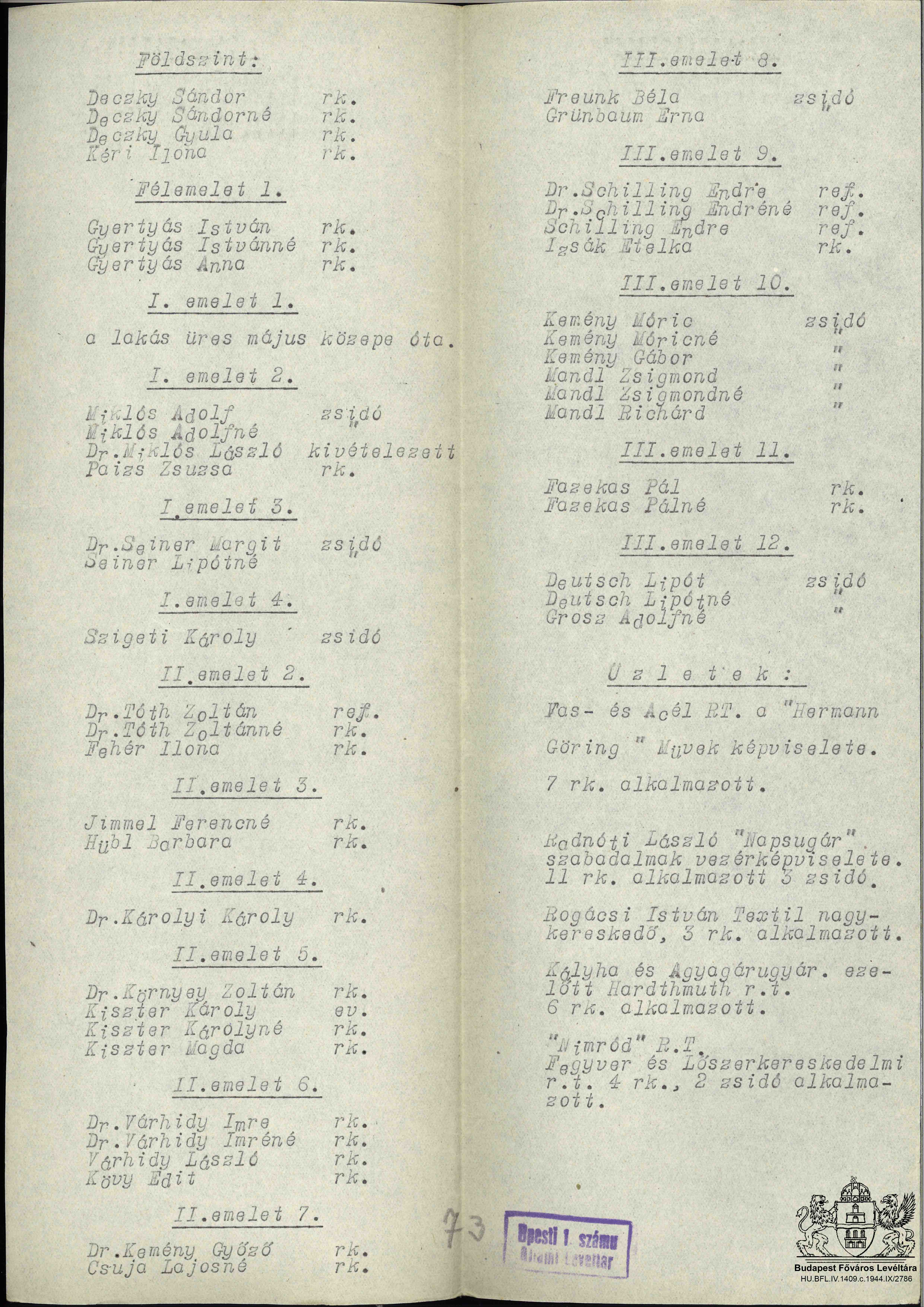 "... hogy mi maradhassunk és ők távozzanak" - Lakossági reakciók a csillagos házak kijelölésére PreviousNext Toggle image Lakónévsor (VI. Andrássy út 6.) Dokumentum típusa kérelem Keletkezés ideje 1944.06 Őrzési hely Budapest Főváros Levéltára Vonatkozó alkotás "... hogy mi maradhassunk és ők távozzanak" - Lakossági reakciók a csillagos házak kijelölésére Jelzet HU BFL IV.1409.c 2786/1944-IX. Letöltés PreviousNext