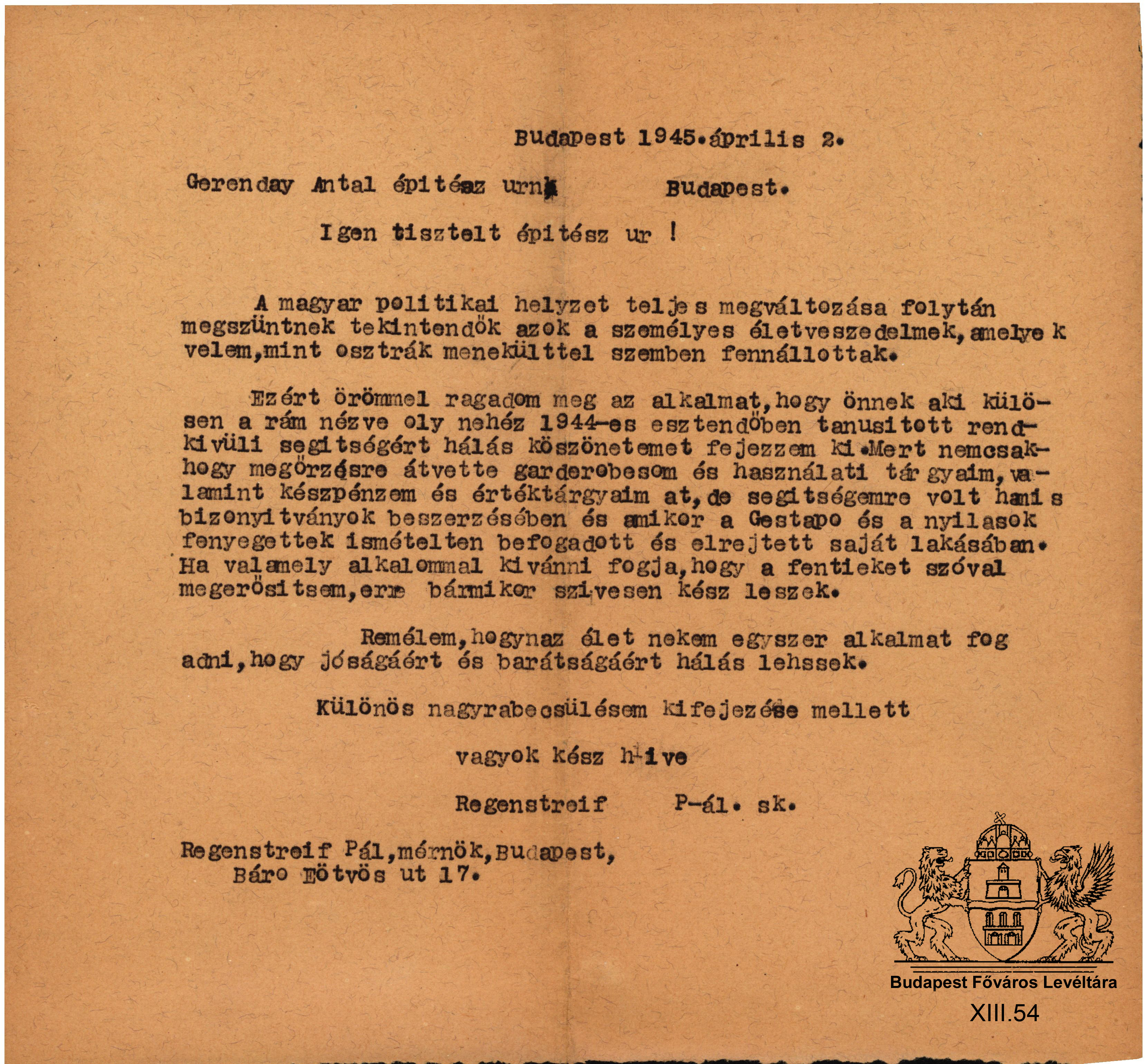 A zsidómentő Gerenday Previous Toggle image Regenstreif Pál nyilatkozata Dokumentum típusa Nyilatkozat Keletkezés ideje 1945 Őrzési hely Budapest Főváros Levéltára Vonatkozó alkotás A zsidómentő Gerenday Jelzet XIII.54 Gerenday család iratai Letöltés Previous