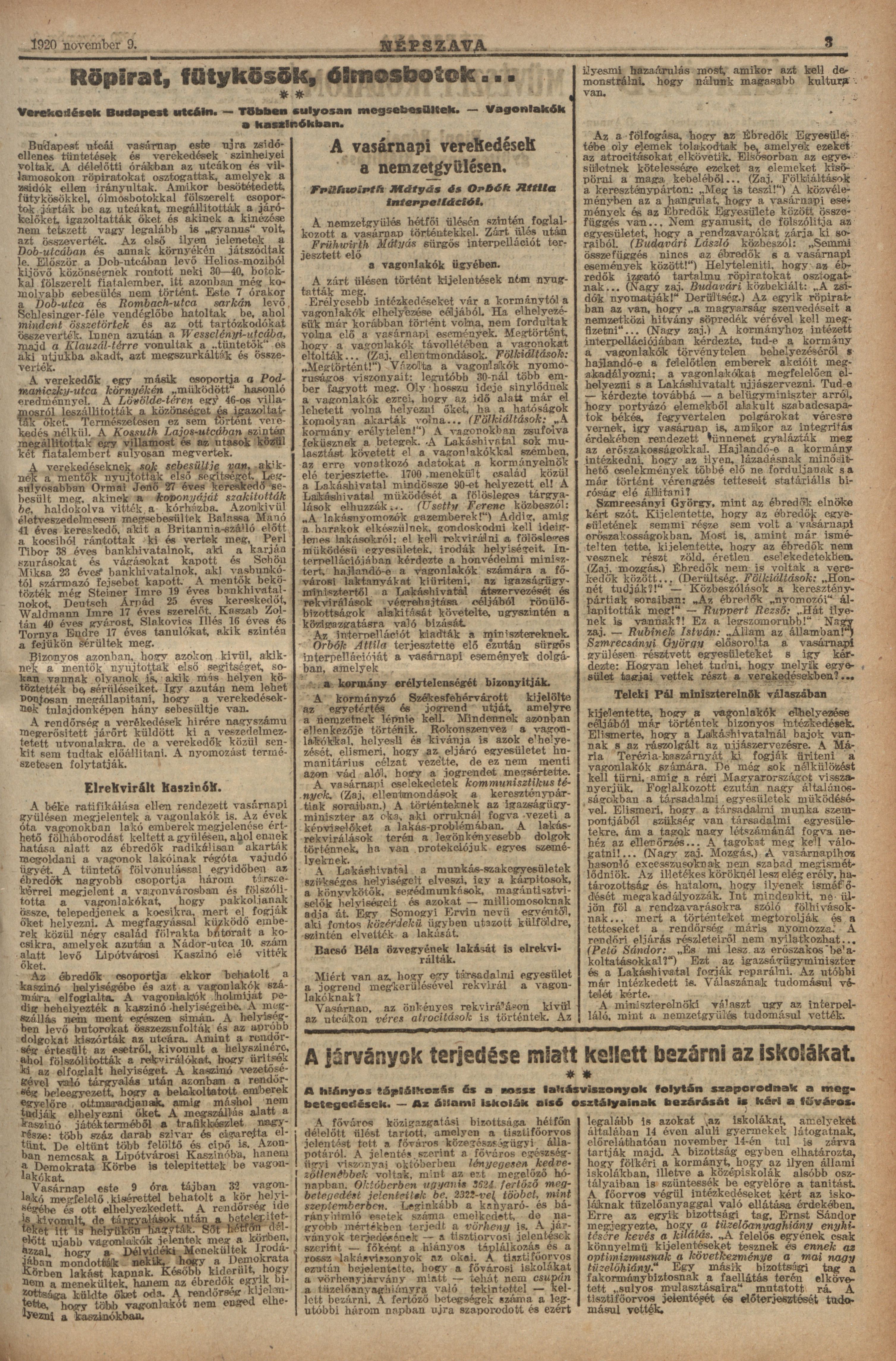 A Népszava c. napilap 1920. november 9-i számában megjelent tudósítás a trianoni békeszerződés ratifikálása előtti gyűlés kapcsán a fővárosban lezajlott erőszakos cselekményekről.