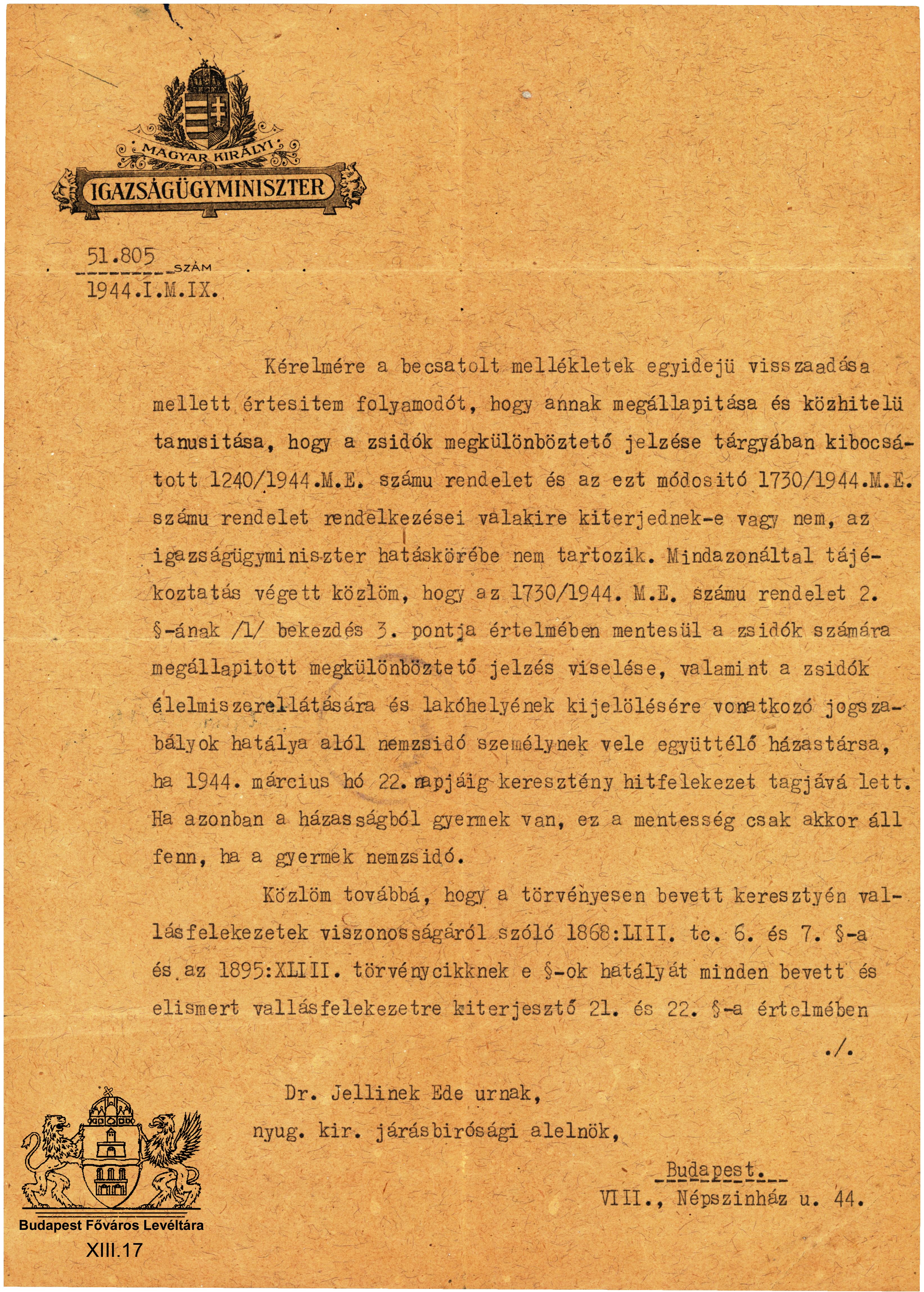 A jogfosztott járásbíró Next Toggle image Sárga csillag viselése alóli igazságügyminiszteri határozat 1. Dokumentum típusa határozat Keletkezés ideje 1944.08.01 Őrzési hely Budapest Főváros Levéltára Vonatkozó alkotás A jogfosztott járásbíró Jelzet XIII.17 Letöltés Next