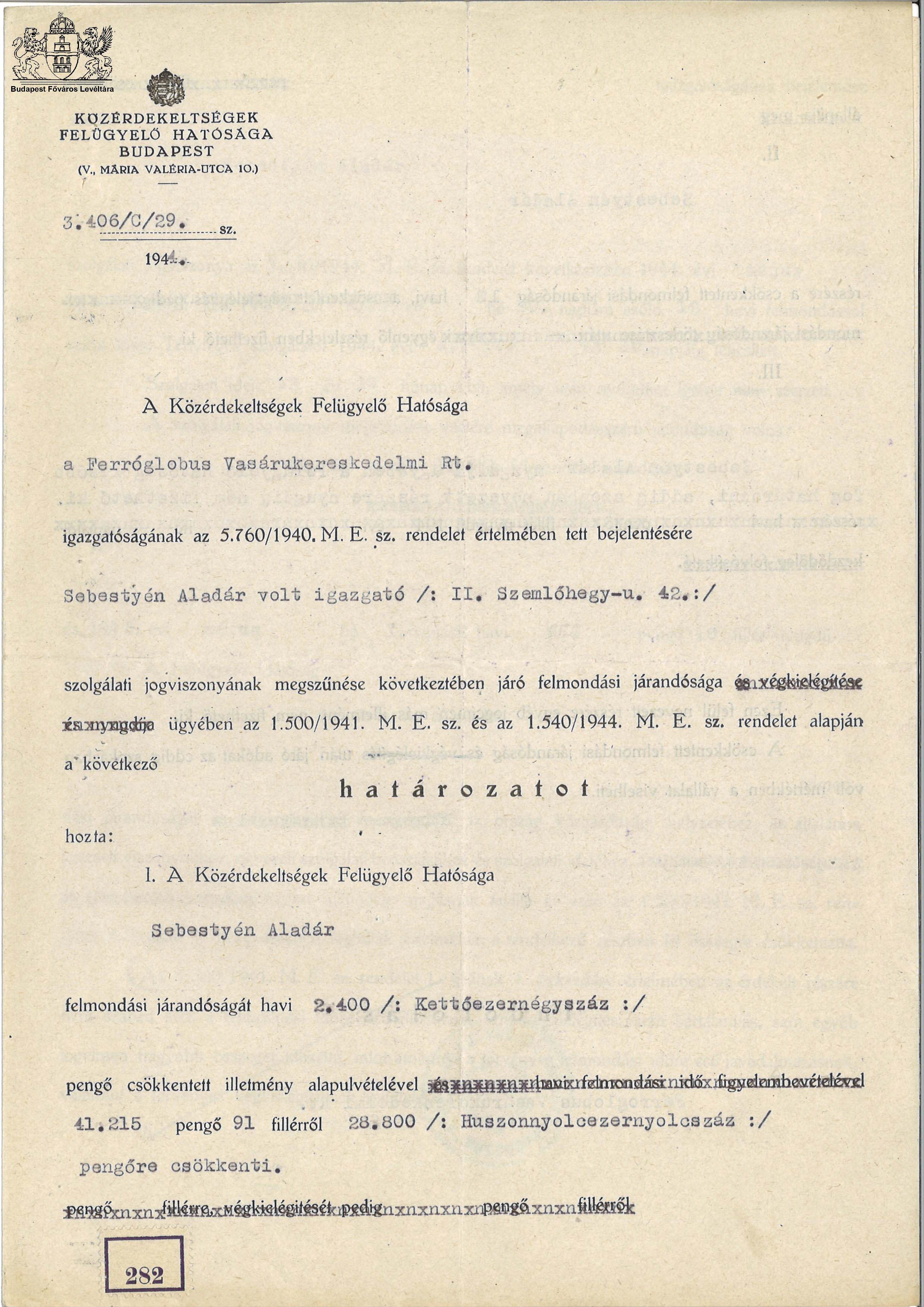 Sebestyén Aladár felmondási járandósága