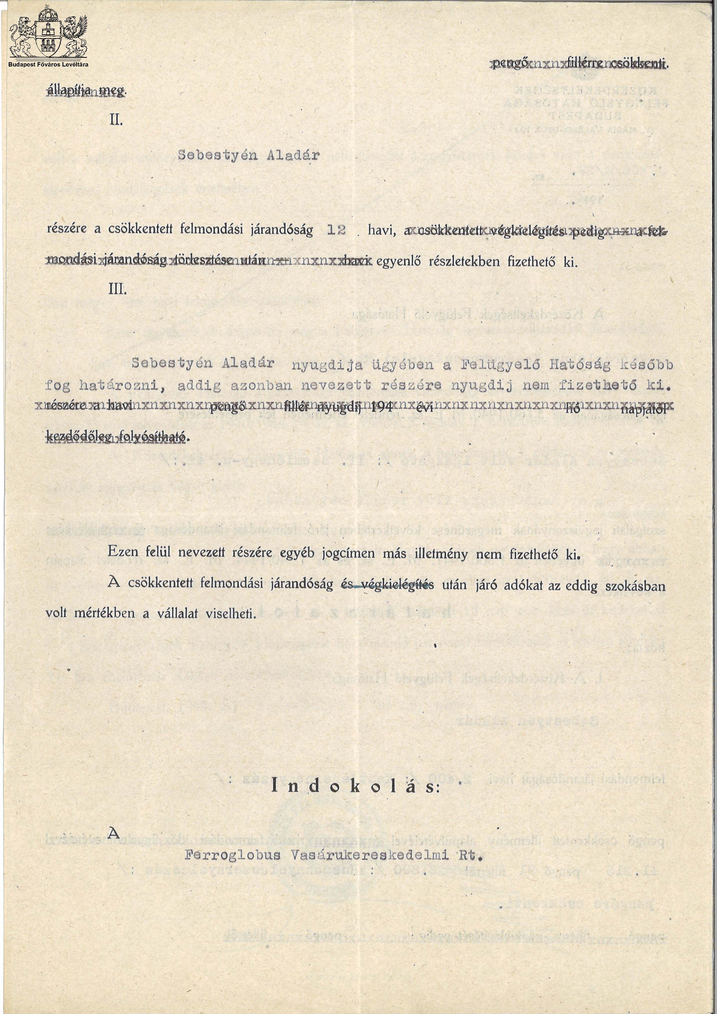 Sebestyén Aladár felmondási járandósága