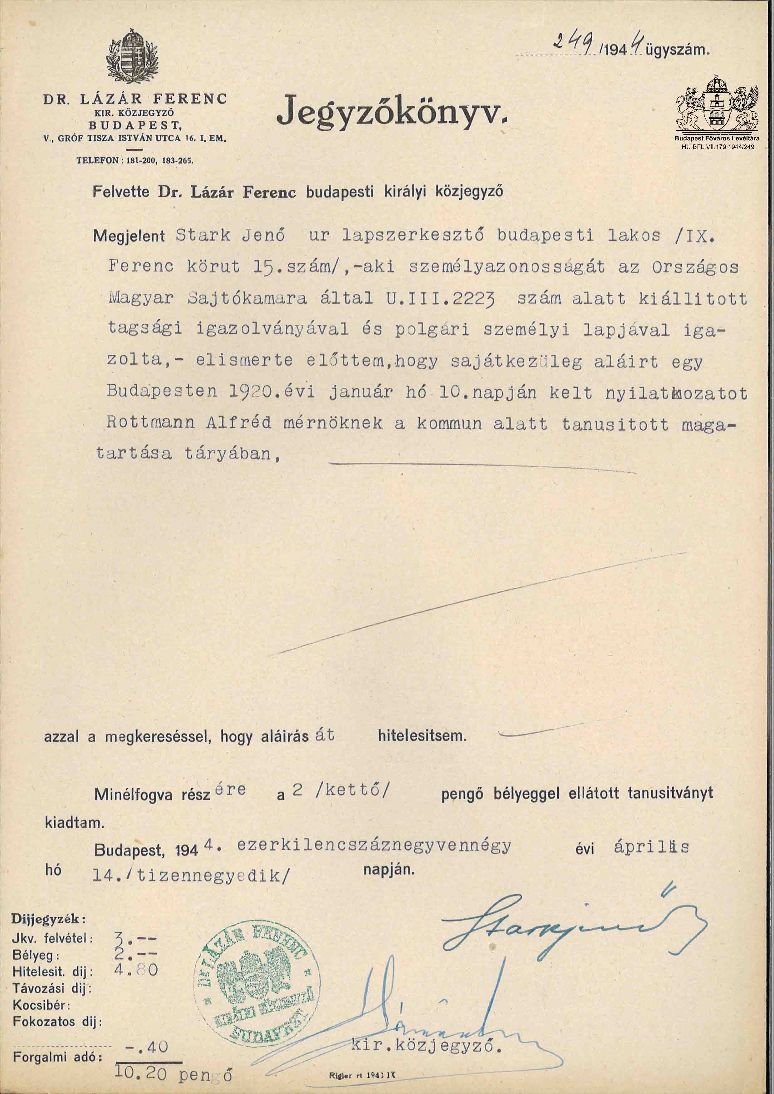 Az 1919-es kommün alatt tanúsított magatartás is lehetett fontos alap zsidóellenes rendelkezések alóli mentesség kéréséhez. Az erről szóló nyilatkozatokat a közjegyző előtt legtöbbször pusztán bemutatták, aki azt egy aláírás hitelesítési eljárás keretében hitelesítette, és erről jegyzőkönyvet állított ki. Viszonylag nagy számban találhatók ilyen nyilatkozatok, azonban legtöbbször csupán annyi áll bennük, hogy pl. „Rottman Alfréd mérnöknek a kommün alatt tanúsított magatartása tárgyában”.
