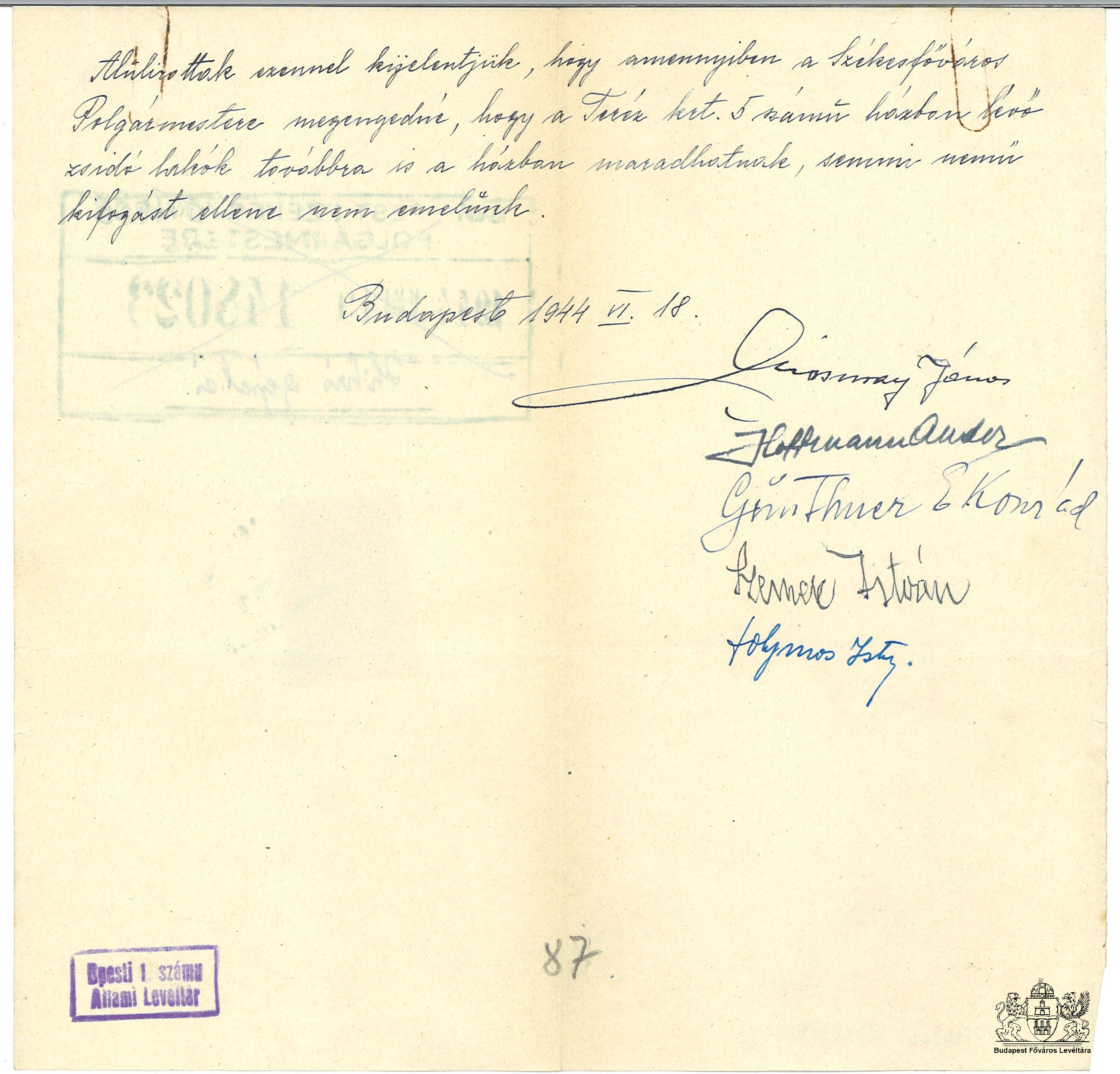 "... hogy mi maradhassunk és ők távozzanak" - Lakossági reakciók a csillagos házak kijelölésére PreviousNext Toggle image A VI. Teréz krt. 5. számú ház lakóinak nyilatkozata Dokumentum típusa kérelem Keletkezés ideje 1944.06.18 Őrzési hely Budapest Főváros Levéltára Vonatkozó alkotás "... hogy mi maradhassunk és ők távozzanak" - Lakossági reakciók a csillagos házak kijelölésére Jelzet HU BFL IV.1409.c 2783/1944-IX. Letöltés PreviousNext