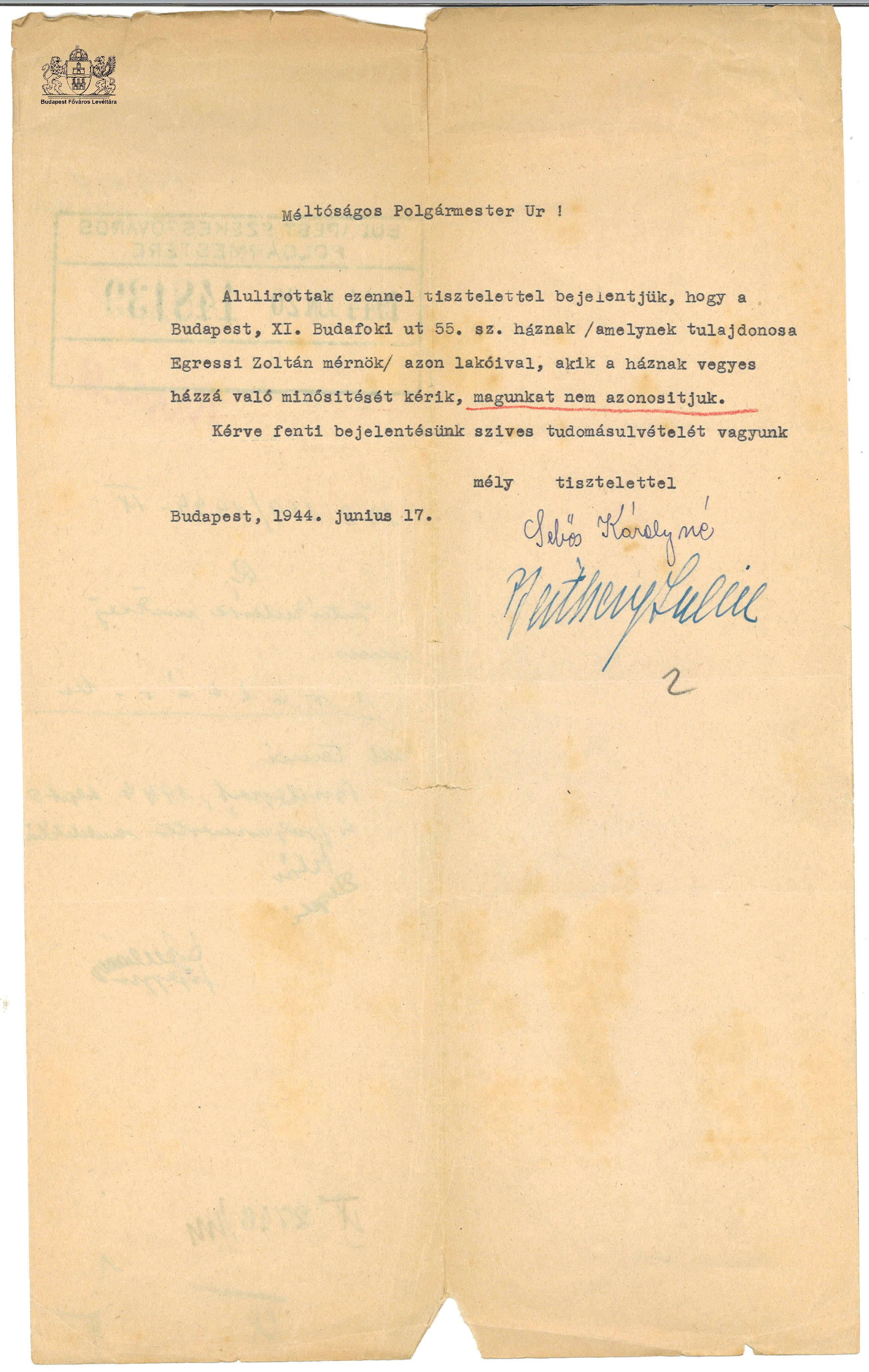 "... hogy mi maradhassunk és ők távozzanak" - Lakossági reakciók a csillagos házak kijelölésére Previous Toggle image A XI. Budafoki út 55. számú ház lakóinak bejelentése Dokumentum típusa bejelentés Keletkezés ideje 1944.06.17 Őrzési hely Budapest Főváros Levéltára Vonatkozó alkotás "... hogy mi maradhassunk és ők távozzanak" - Lakossági reakciók a csillagos házak kijelölésére Jelzet HU BFL IV.1409.c 2746/1944-IX. Letöltés Previous