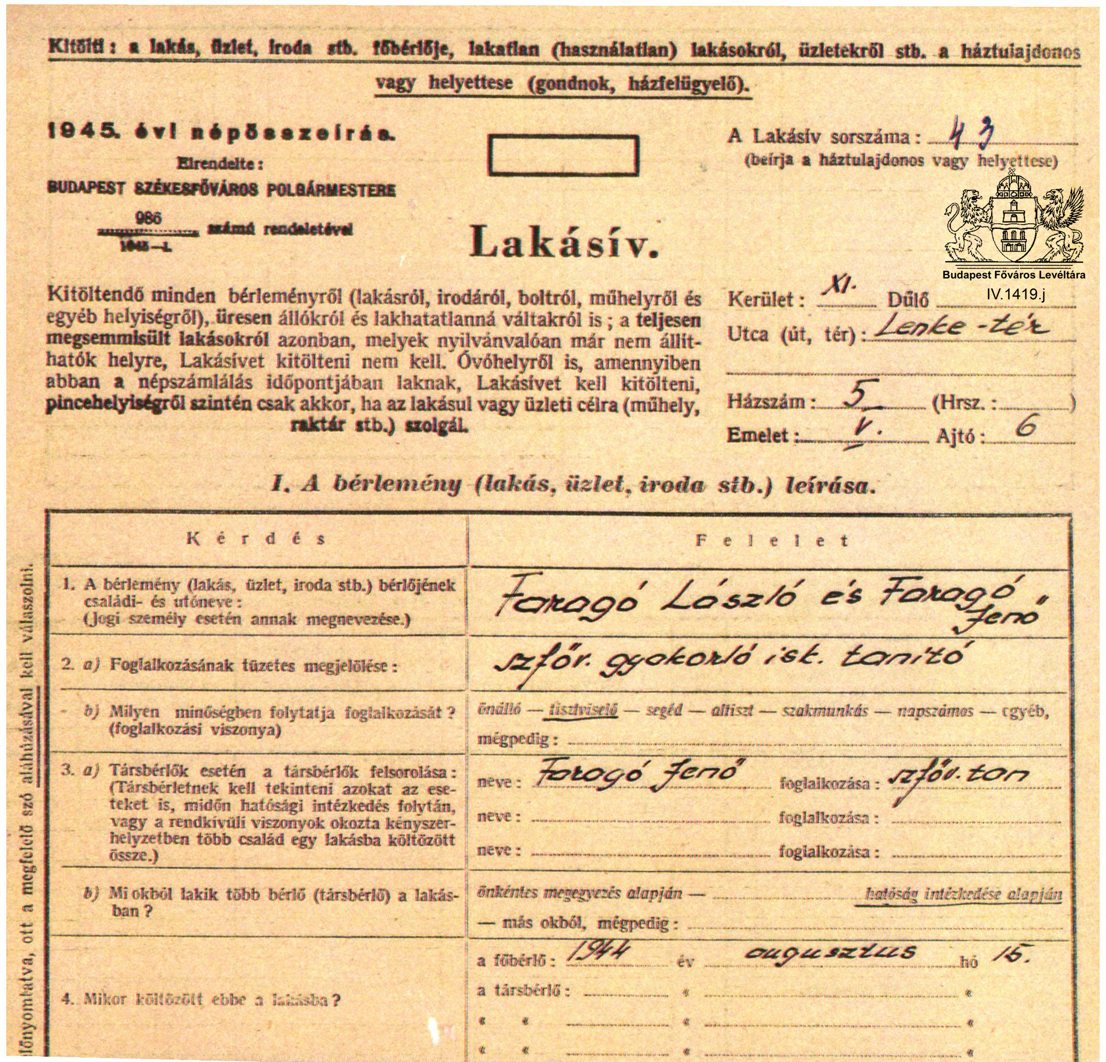 Az Elekes-Király család a városi térben PreviousNext Toggle image A XI., Lenke tér 5. sz. alatti lakás új lakói Dokumentum típusa lakásív Keletkezés ideje 1945 Őrzési hely Budapest Főváros Levéltára Vonatkozó alkotás Az Elekes-Király család a városi térben Jelzet IV.1419.j Letöltés PreviousNext