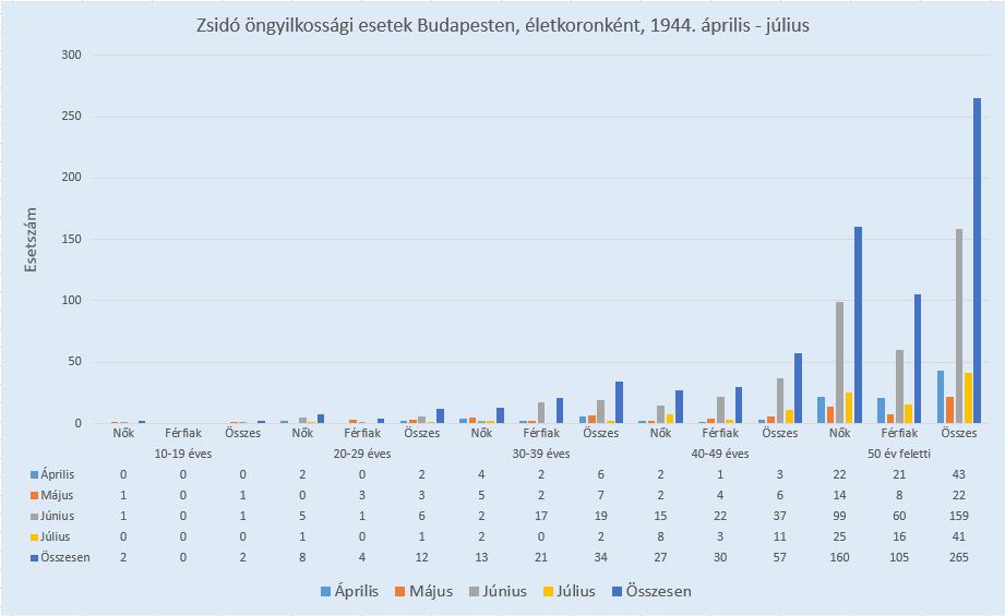 "Az öngyilkosságok rekord-éjszakája" PreviousNext Toggle image Zsidó öngyilkossági esetek Budapesten életkoronként, 1944. április-július Dokumentum típusa statisztika Keletkezés ideje 1944.04 - 1944.07 Vonatkozó alkotás "Az öngyilkosságok rekord-éjszakája" Jelzet A fővárosi statisztikai hivatal kimutatásai alapján készítette: Lugosi András és Horváth J. András Letöltés PreviousNext